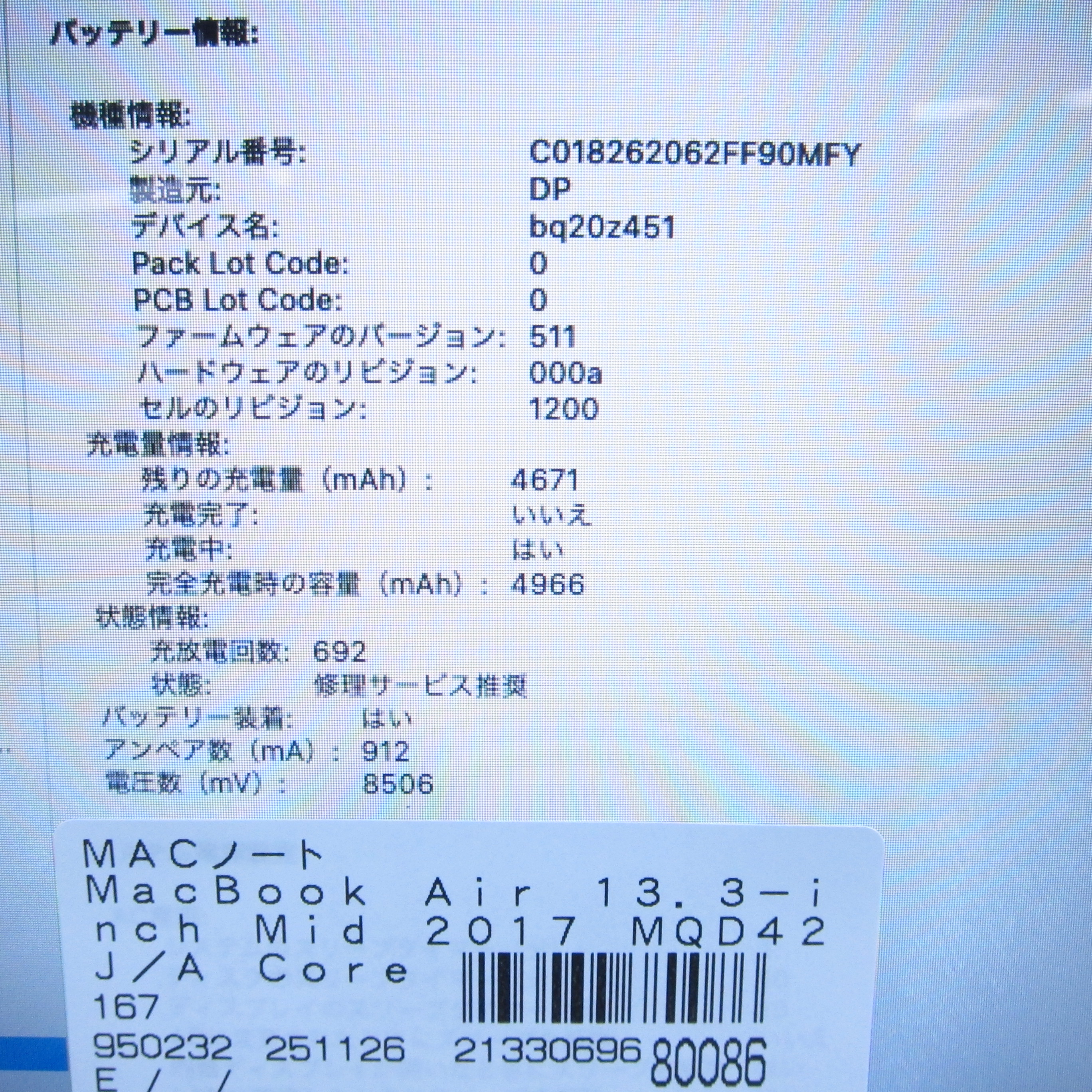 〔中古品(難あり)〕 MacBook Air 13.3-inch Mid-2017 MQD42J/A Core_i5 1.8GHz 8GB SSD256GB 〔10.15 Catalina〕 [グラフィック:Intel HD Graphics 6000/その他海外キーボード]