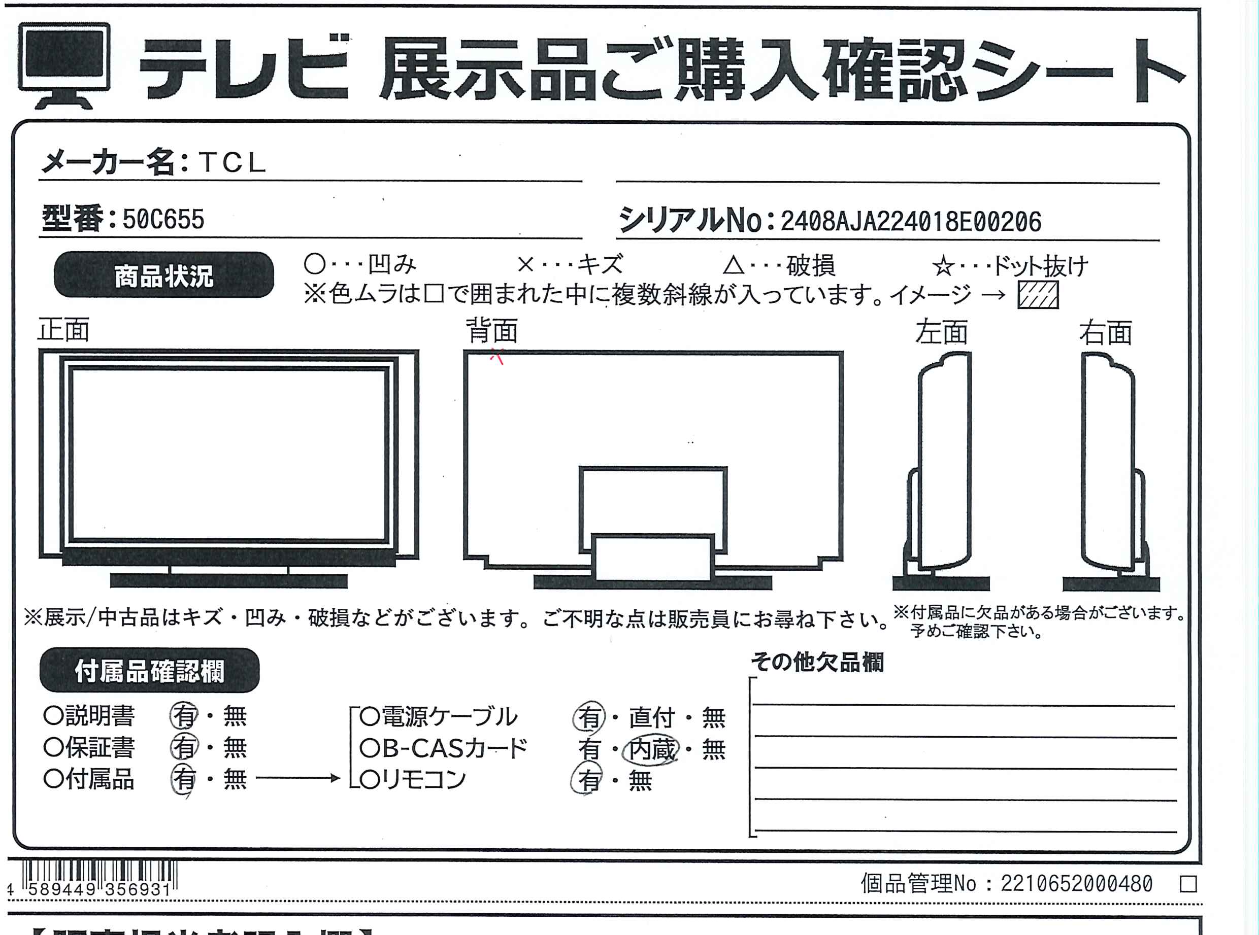 『B-CASカード(赤色)』 の付属については、付属品欄 および 展示品ご購入確認シート(画像)にてご確認ください。