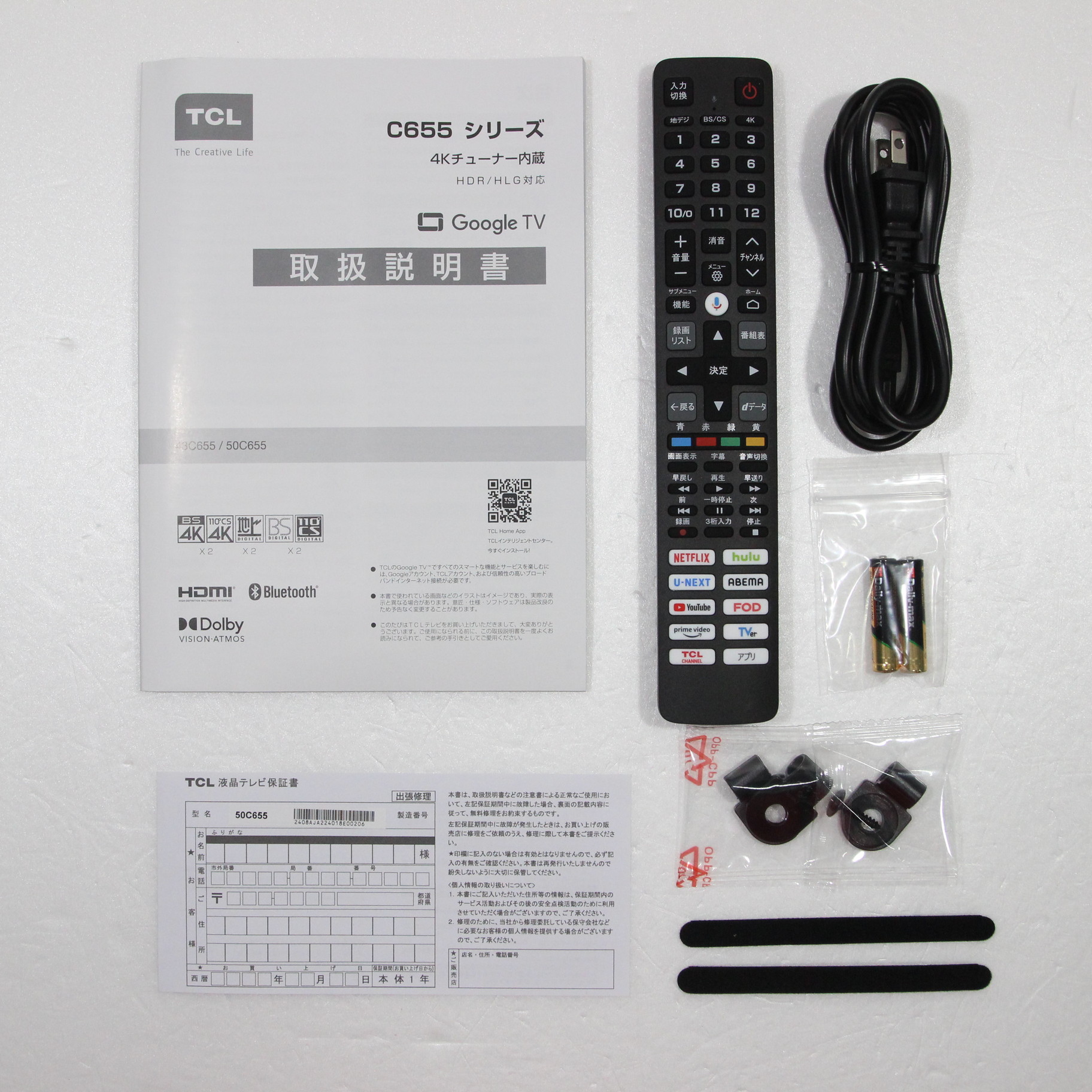 〔付属品〕取扱説明書、かんたんガイド、リモコン、リモコン用乾電池×2、電源コード、スタンド一式、マジックテープ×2、VESAネジ×2、ネジ(ST4)(20mm)、クリップ×3
