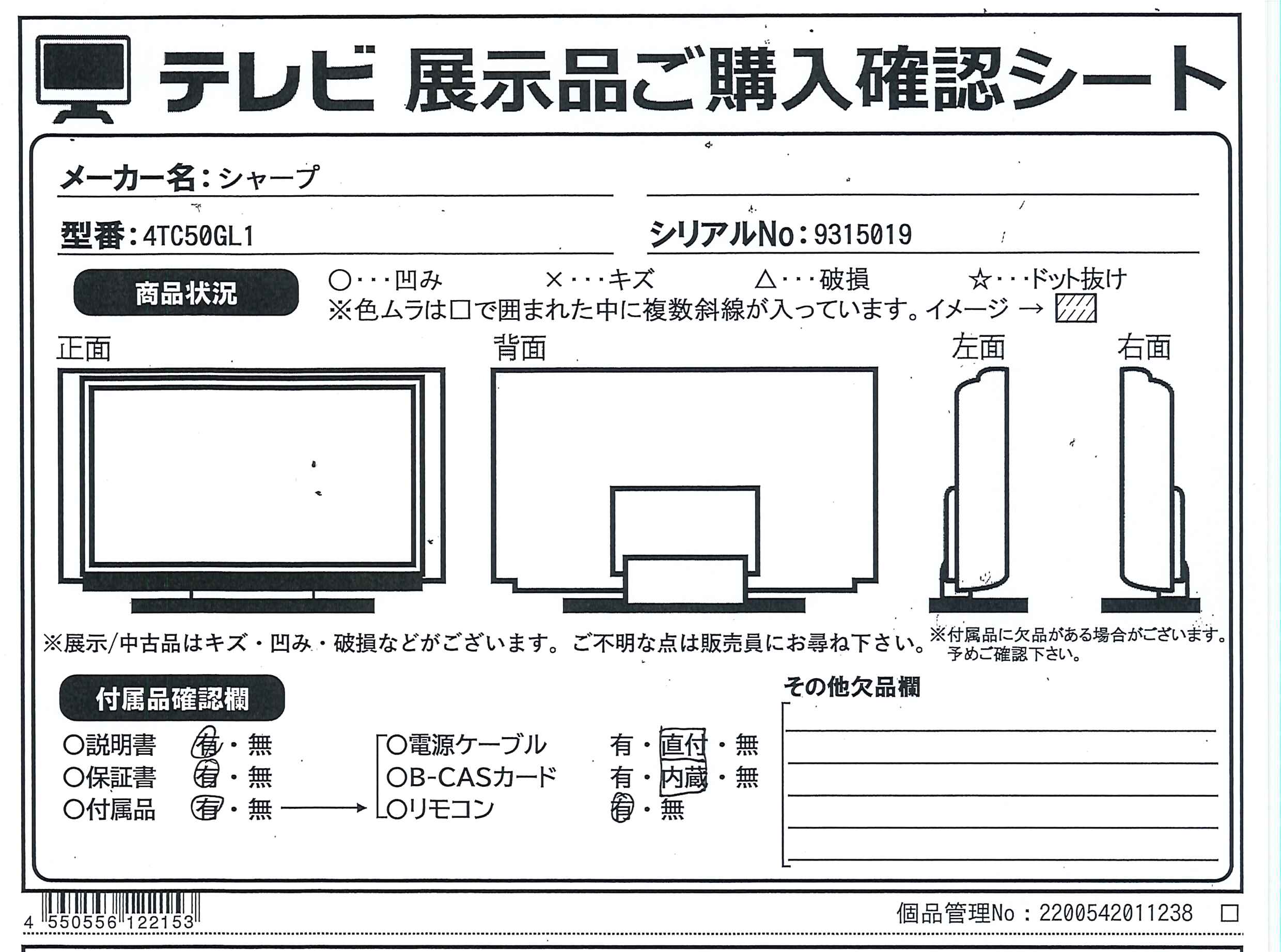 中古商品ランクについて 付属品・商品状態について 〔付属品〕説明書、リモコン、リモコン用単4形乾電池×2、スタンド(R)、スタンド(L)、スタンド取付用ネジ×4、転倒防止ベルト一式