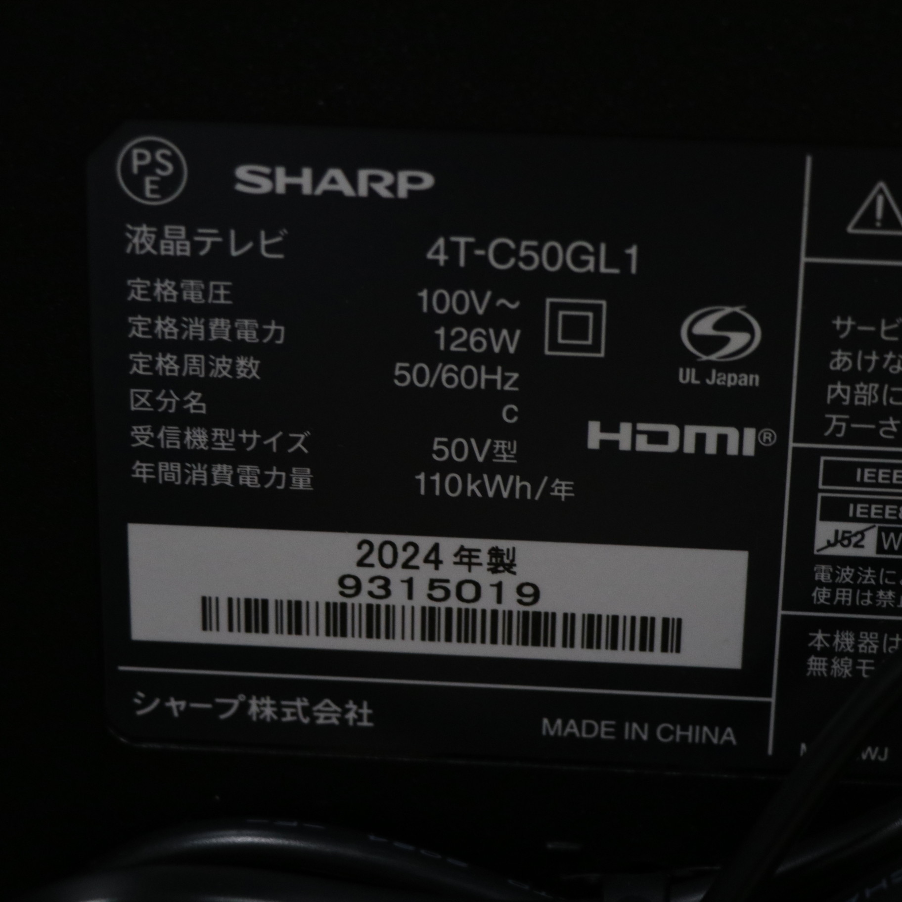 〔展示品〕 液晶テレビ AQUOS(アクオス) 4T-C50GL1 [50V型 /Bluetooth対応 /4K対応 /BS・CS 4Kチューナー内蔵 /YouTube対応]