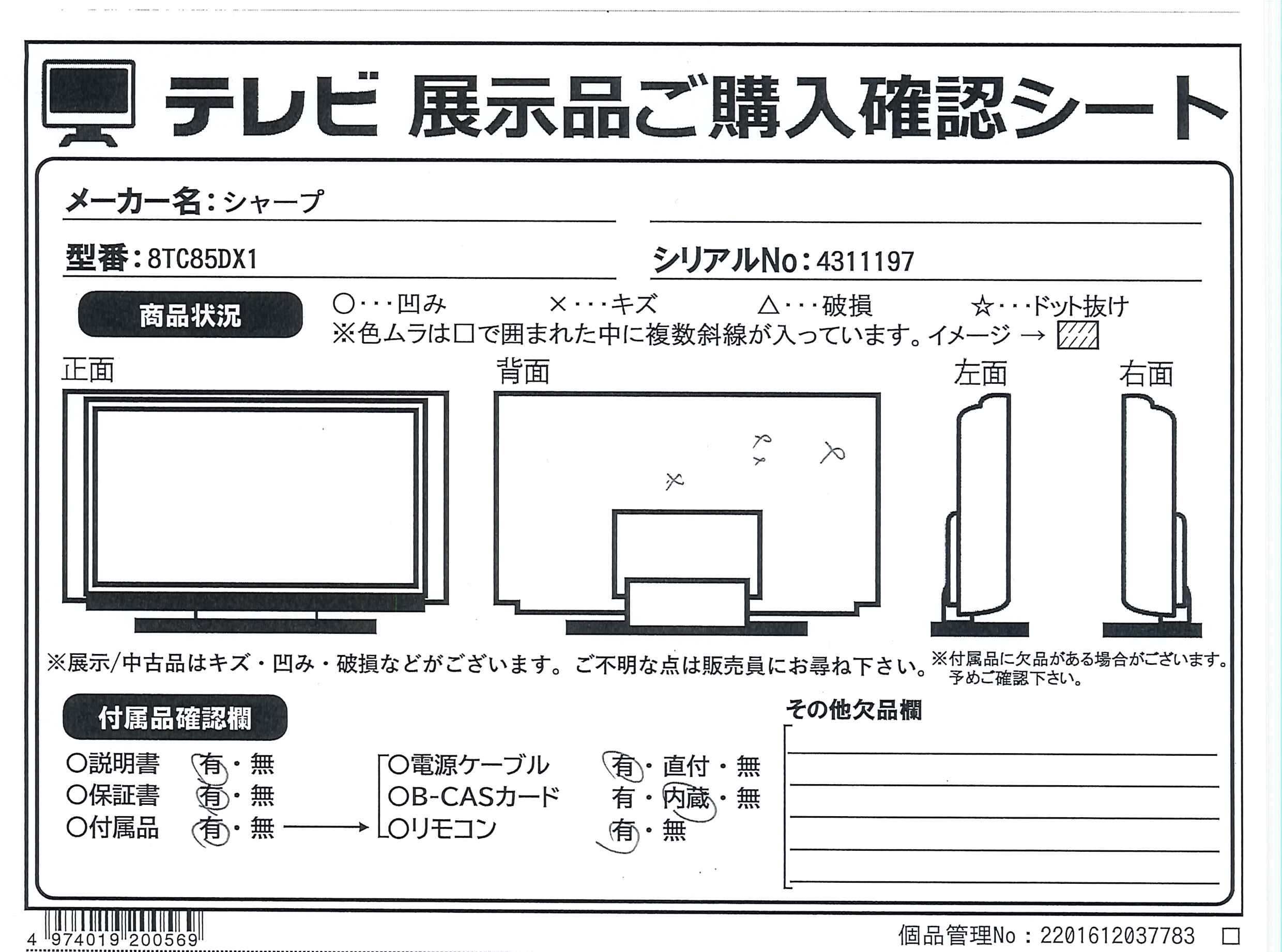 中古商品ランクについて 付属品・商品状態について 〔付属品〕取扱説明書、かんたん使い方ガイド、リモコン、単4乾電池2本、スタンドネック、スタンドベース、スタンド用ネジM4×8本、転倒防止ワイヤー、転倒防止ワイヤー取付ネジ2本、ホルダー、電源コード
