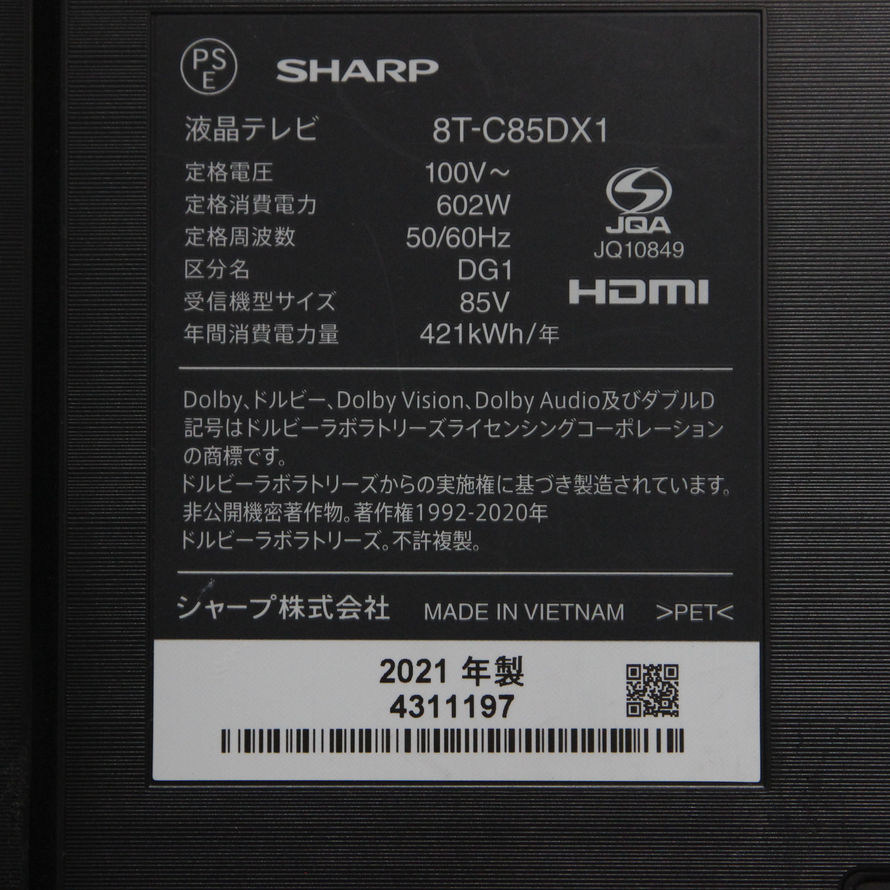 〔展示品〕 液晶テレビ AQUOS 8T-C85DX1 [85V型 /Bluetooth対応 /8K対応 /BS 8Kチューナー内蔵 /YouTube対応]