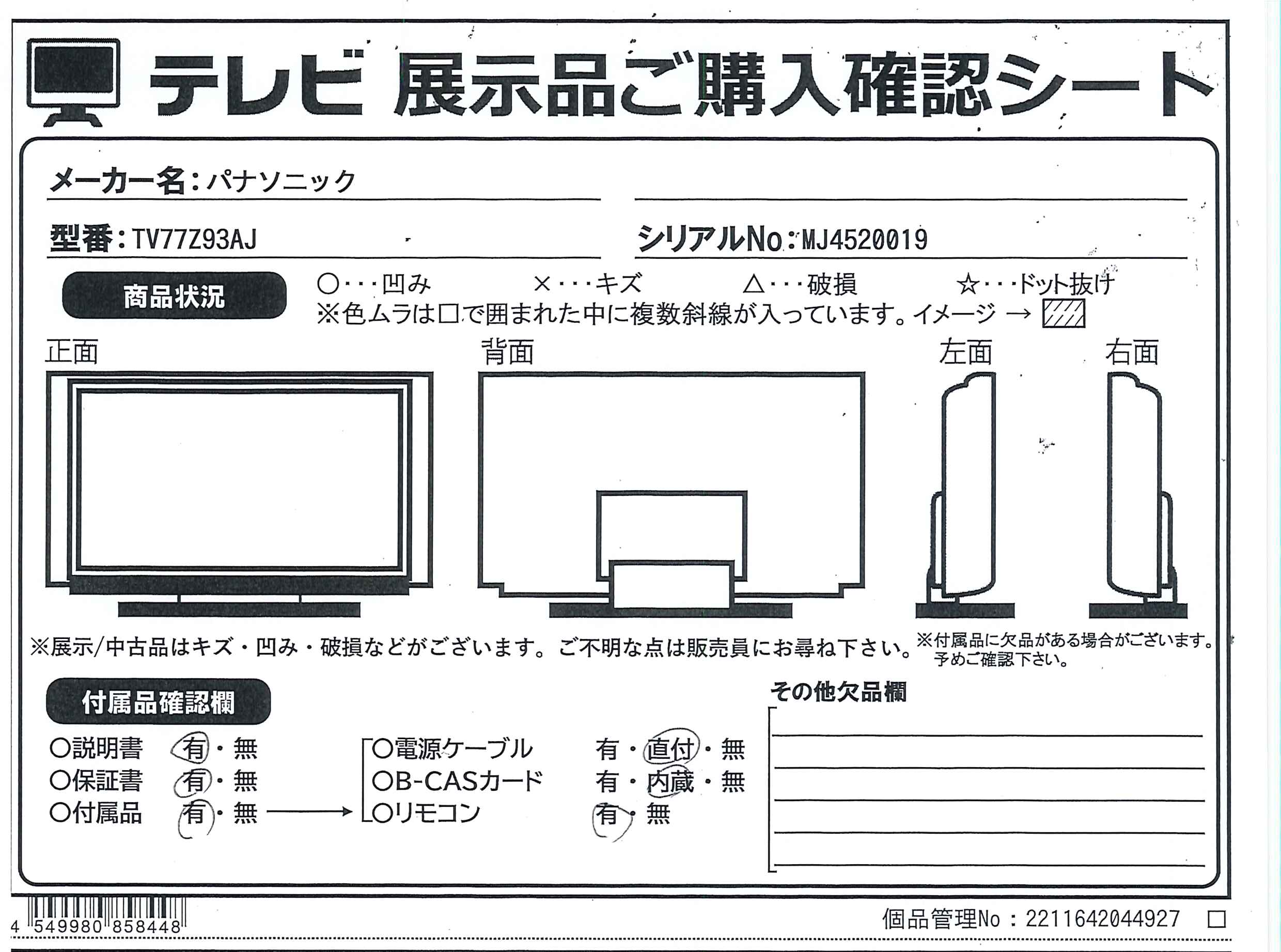 中古商品ランクについて 付属品・商品状態について 〔付属品〕取扱説明書、リモコン(品番:N2QBYA000078)、リモコン用単4形乾電池×2、転倒防止スタンド、本体固定用ねじ(黒 M4×15)×4、壁掛け用ネジ(黒 M8×20)×4、クランパー、ベルト、ねじ(ベルト用)黒、木ねじ シルバー、金具×2