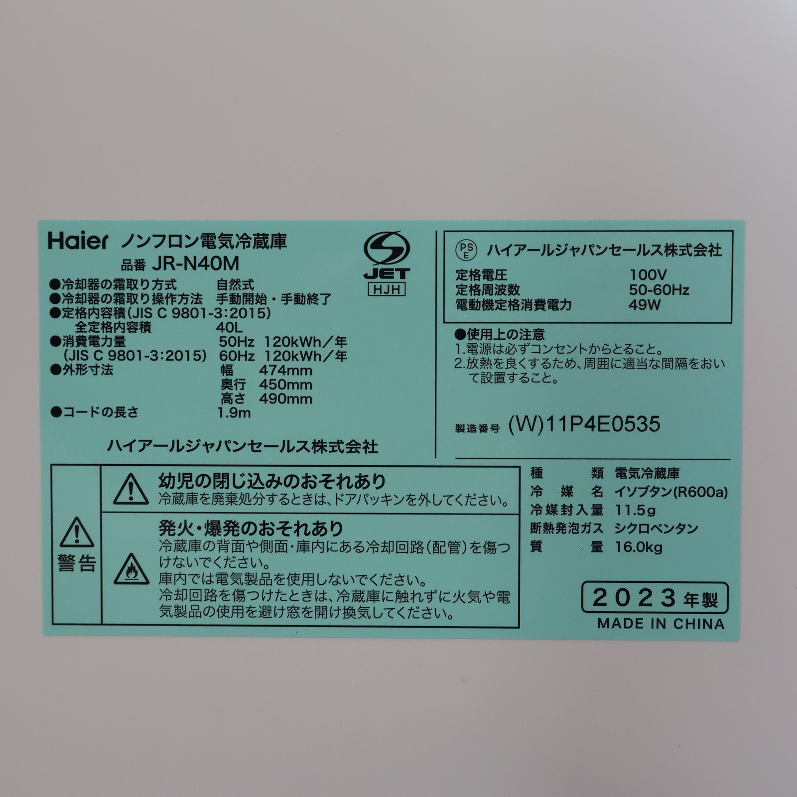 〔展示品〕 直冷式冷蔵庫 ホワイト JR-N40M-W [幅47.4cm /40L /1ドア /右開きタイプ /2023年]