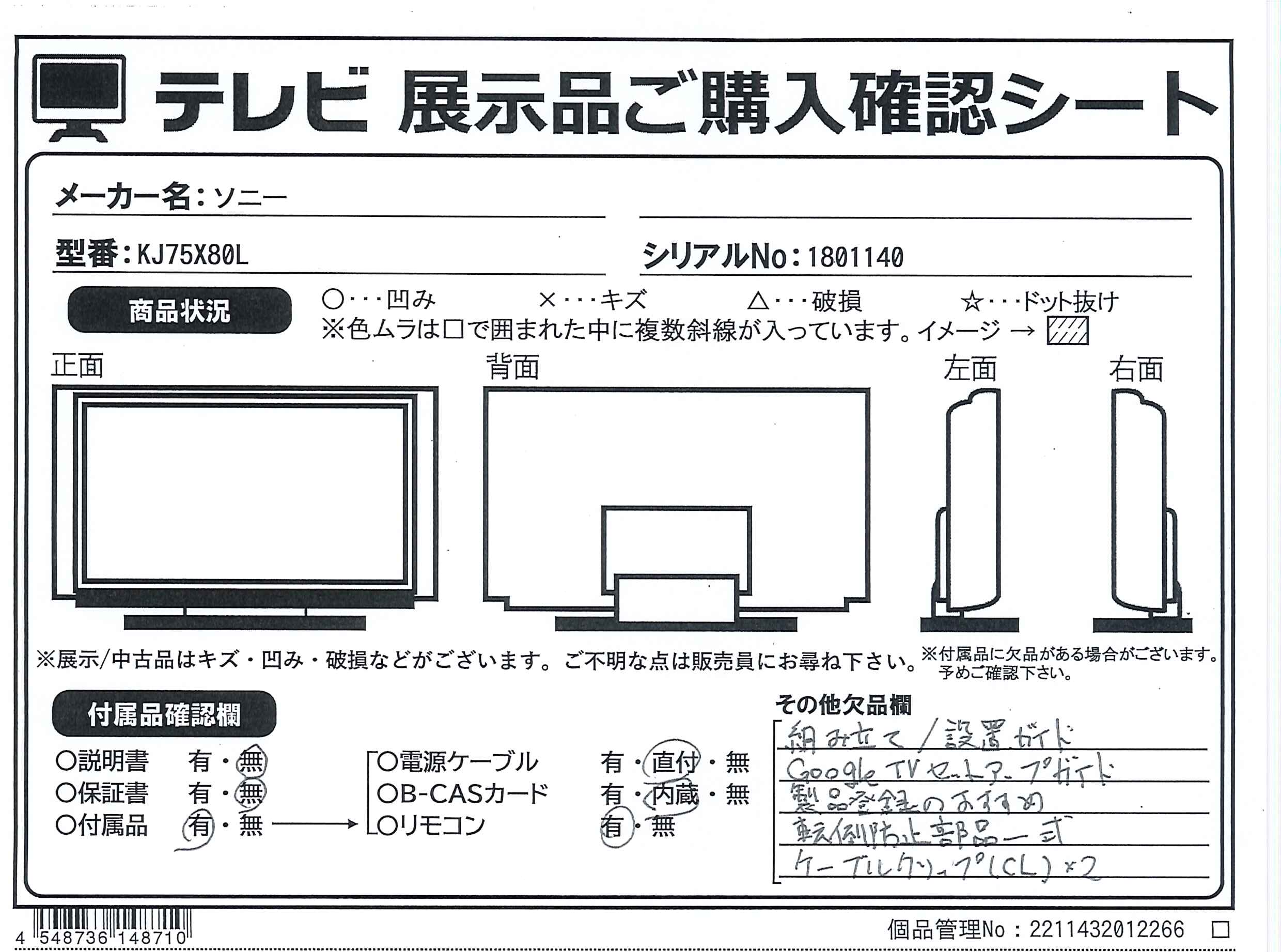 中古商品ランクについて 付属品・商品状態について 〔付属品〕リモコン、リモコン用乾電池×2、スペーサー(VS)×4、スタンド一式