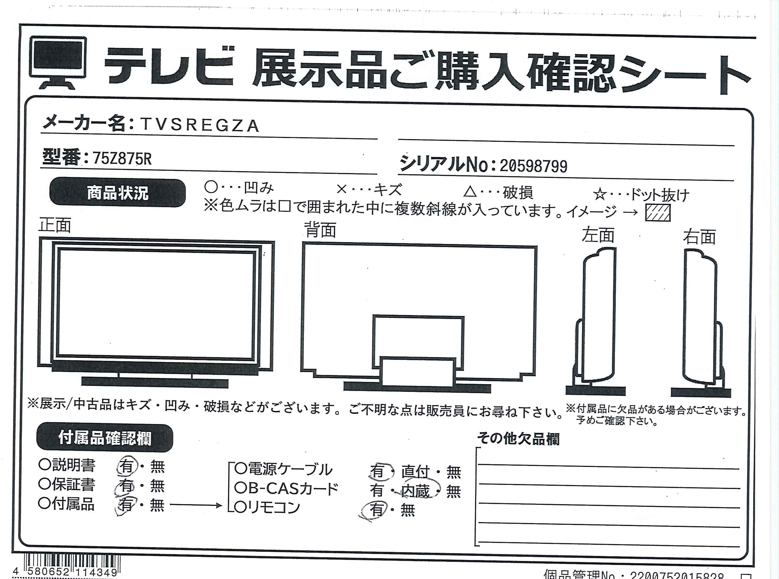 中古商品ランクについて 付属品・商品状態について 〔付属品〕説明書、スタンド一式、リモコン、電源コード、転倒防止ベルト一式、コードクランプ