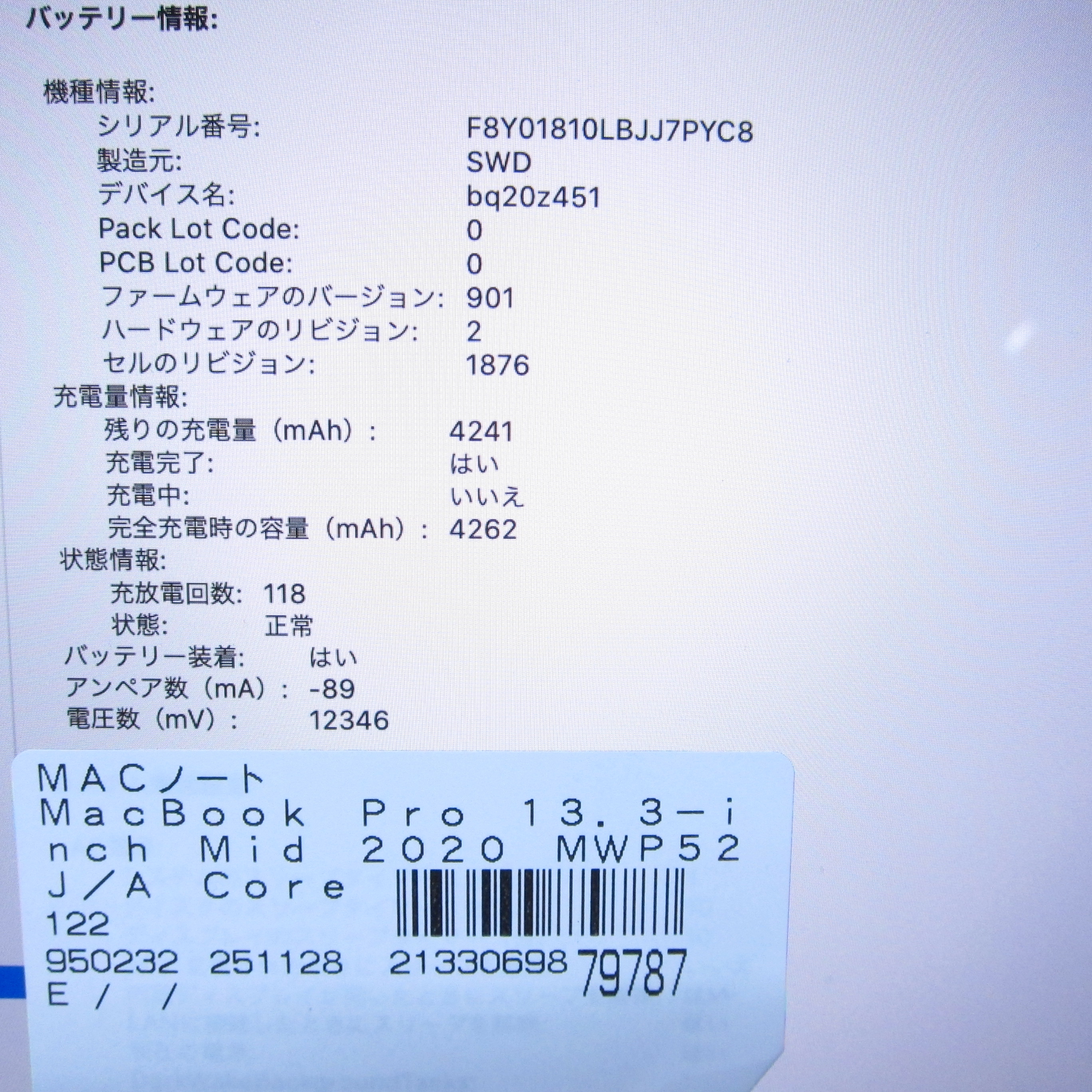 〔中古品〕 MacBook Pro 13.3-inch Mid-2020 MWP52J/A Core_i7 2.3GHz 32GB SSD1TB スペースグレイ 〔10.15 Catalina〕 [グラフィック:Intel Iris Plus Graphics/JISキーボード]