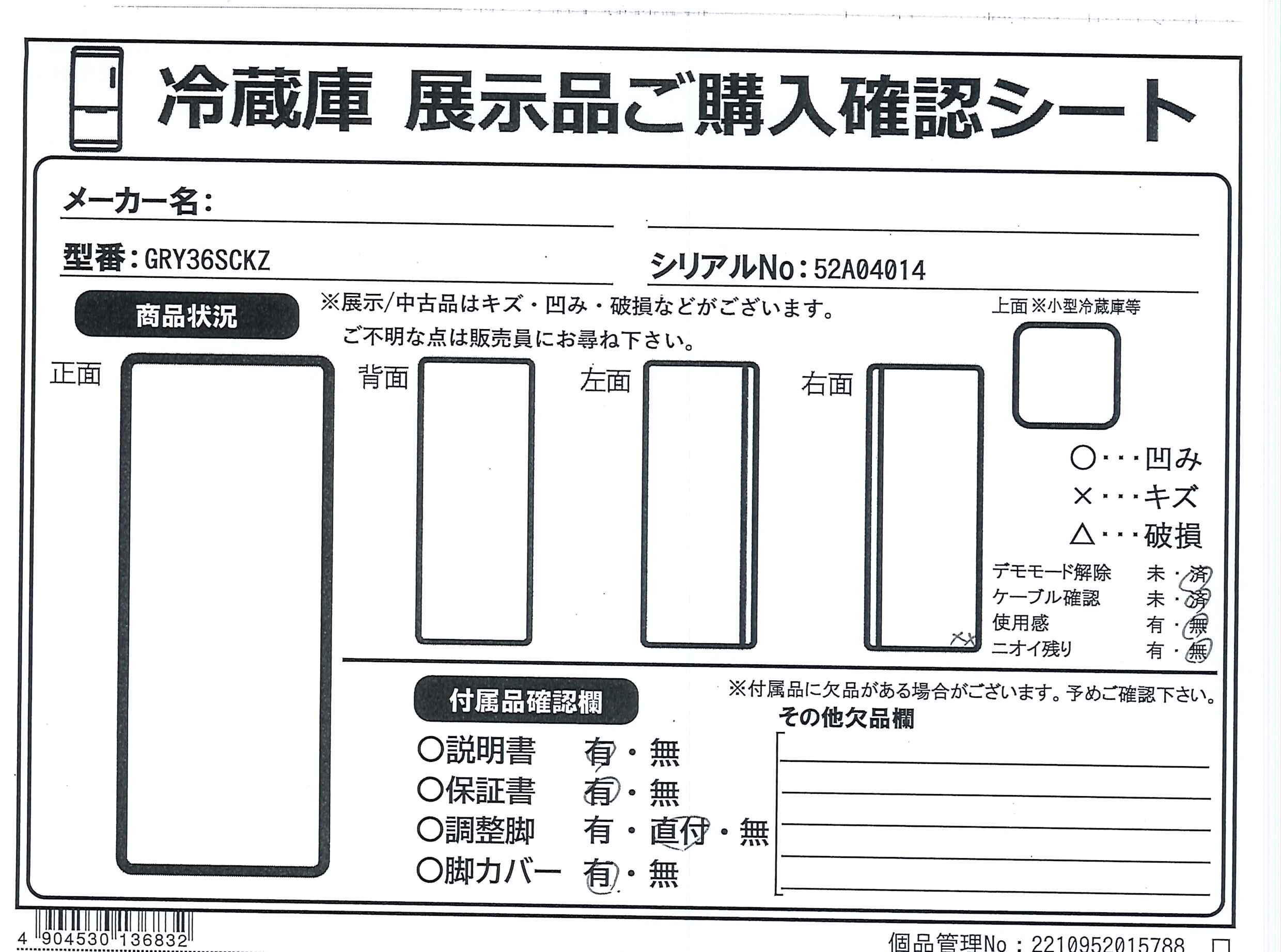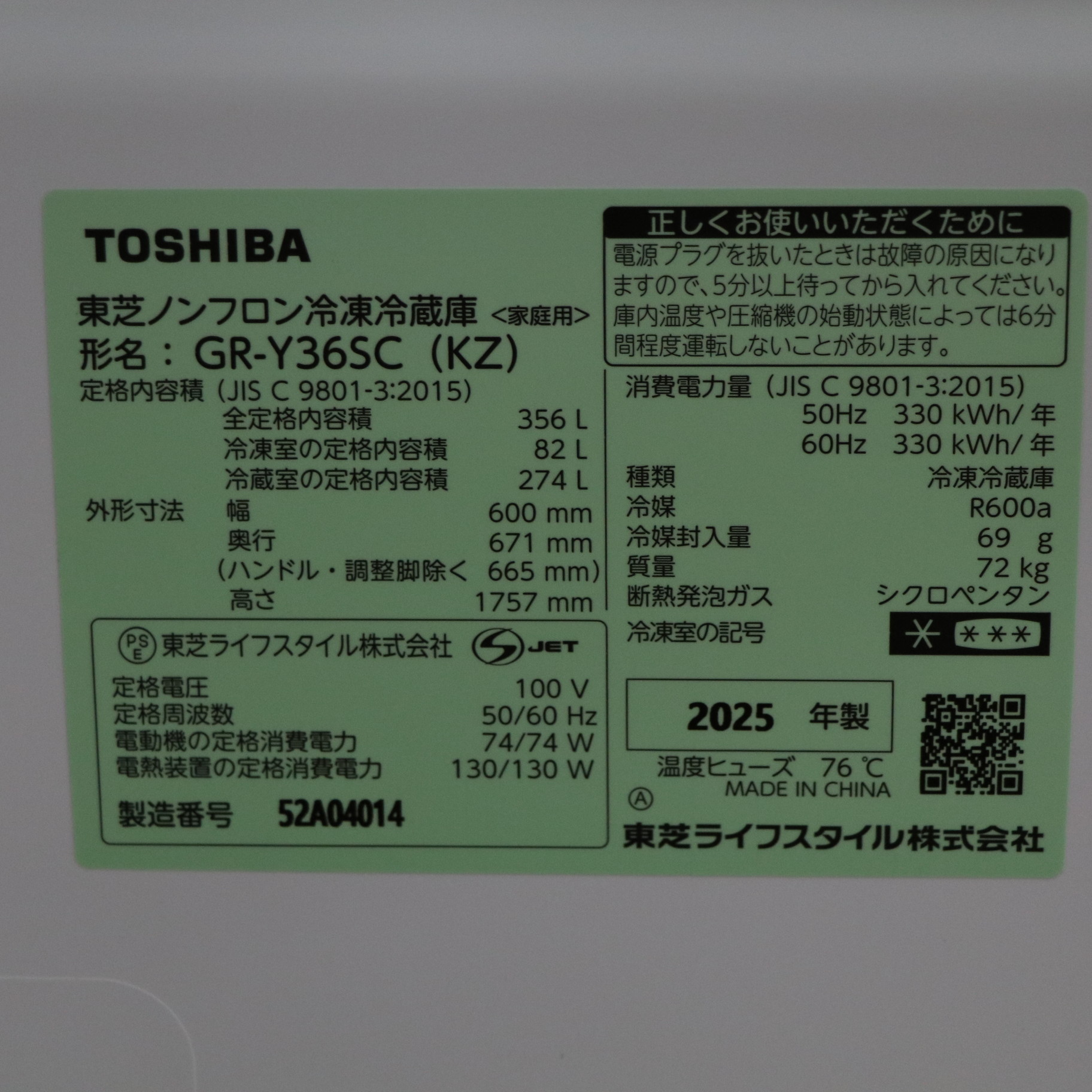 ▼同型番の新品商品はこちら![]() TOSHIBA(東芝) 冷蔵庫 VEGETA(ベジータ)SCシリーズ マットチャコール GR-Y36SC(KZ) [幅60cm /356L /3ドア /右開きタイプ /2025年]【基本設置料金セット】 ¥121,365(税込) 0ポイントサービス お取り寄せ |