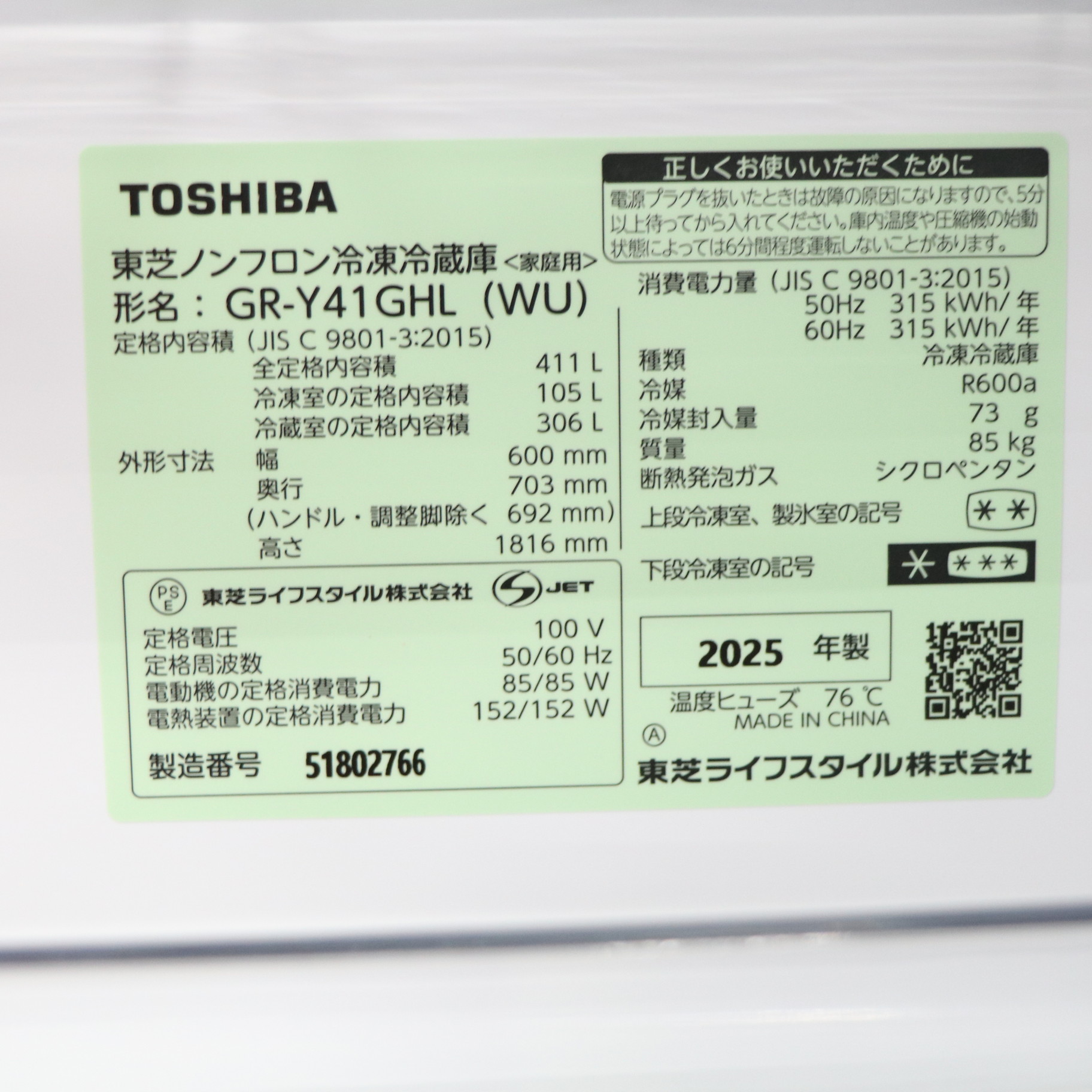 〔展示品〕 冷蔵庫 マットホワイト GR-Y41GHL-WU [幅60cm /411L /5ドア /左開きタイプ /2025年]