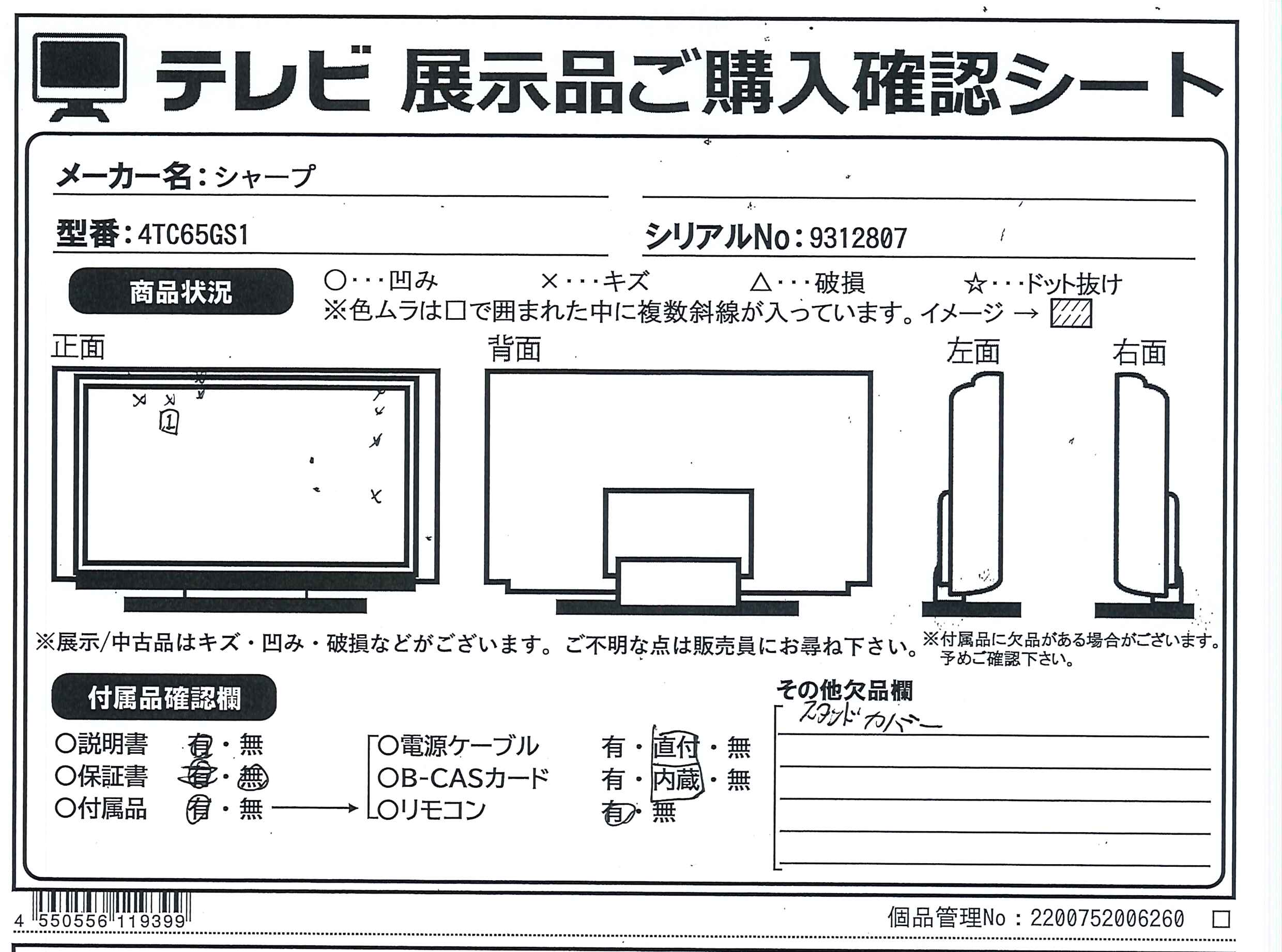 商品名 〔展示品〕 有機ELテレビ AQUOS ブラック 4T-C65GS1 [65V型 /Bluetooth対応 /4K対応 /BS・CS 4Kチューナー内蔵 /YouTube対応]