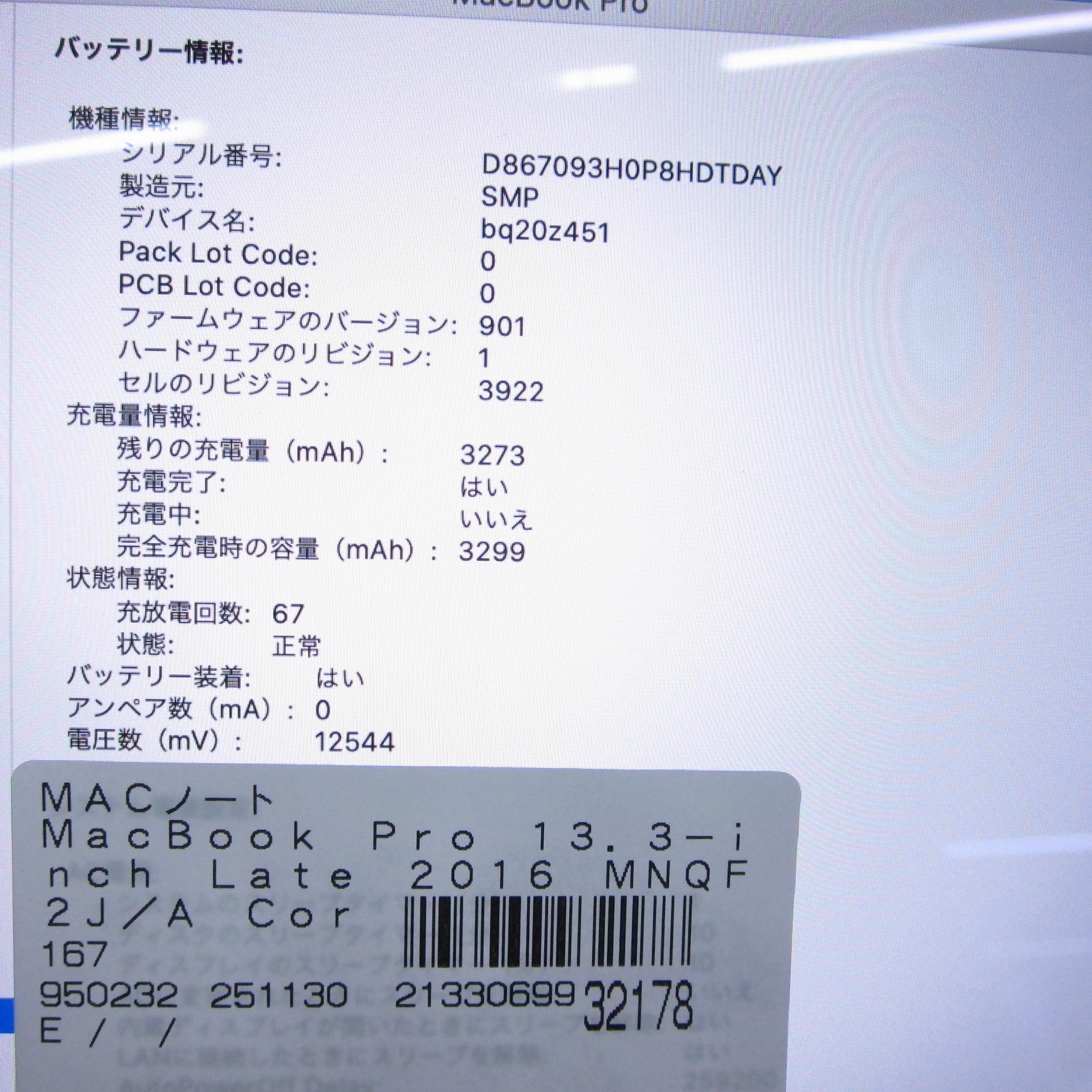 〔中古品〕 MacBook Pro 13.3-inch Late-2016 MNQF2J/A Core_i5 2.9GHz 8GB SSD512GB スペースグレイ 〔10.15 Catalina〕 [グラフィック:Intel Iris Graphics 550(CPU内蔵)/JISキーボード]