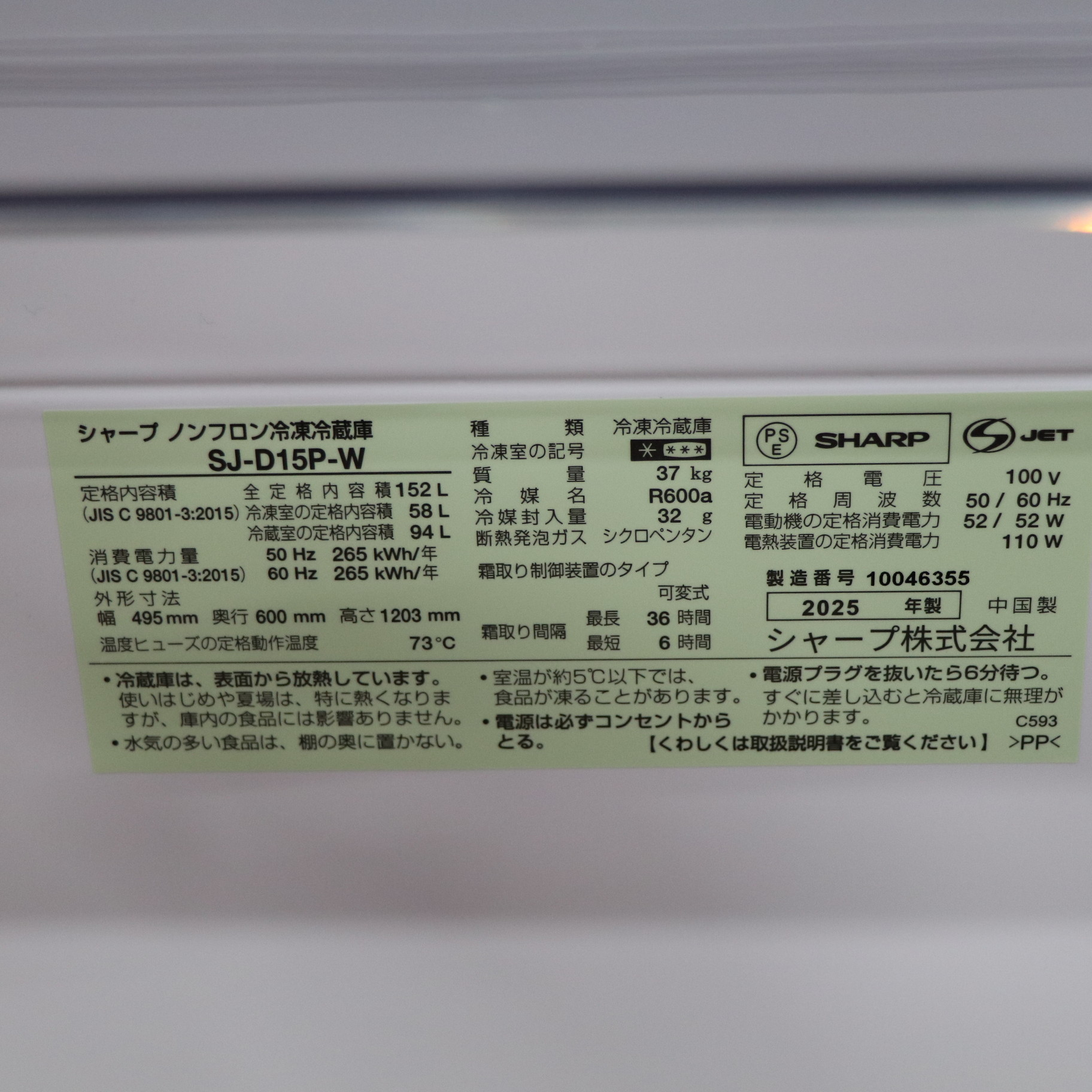 〔展示品〕 冷蔵庫 マットホワイト SJ-D15P-W [幅49.5cm /152L /2ドア /右開き/左開き付け替えタイプ /2024年]