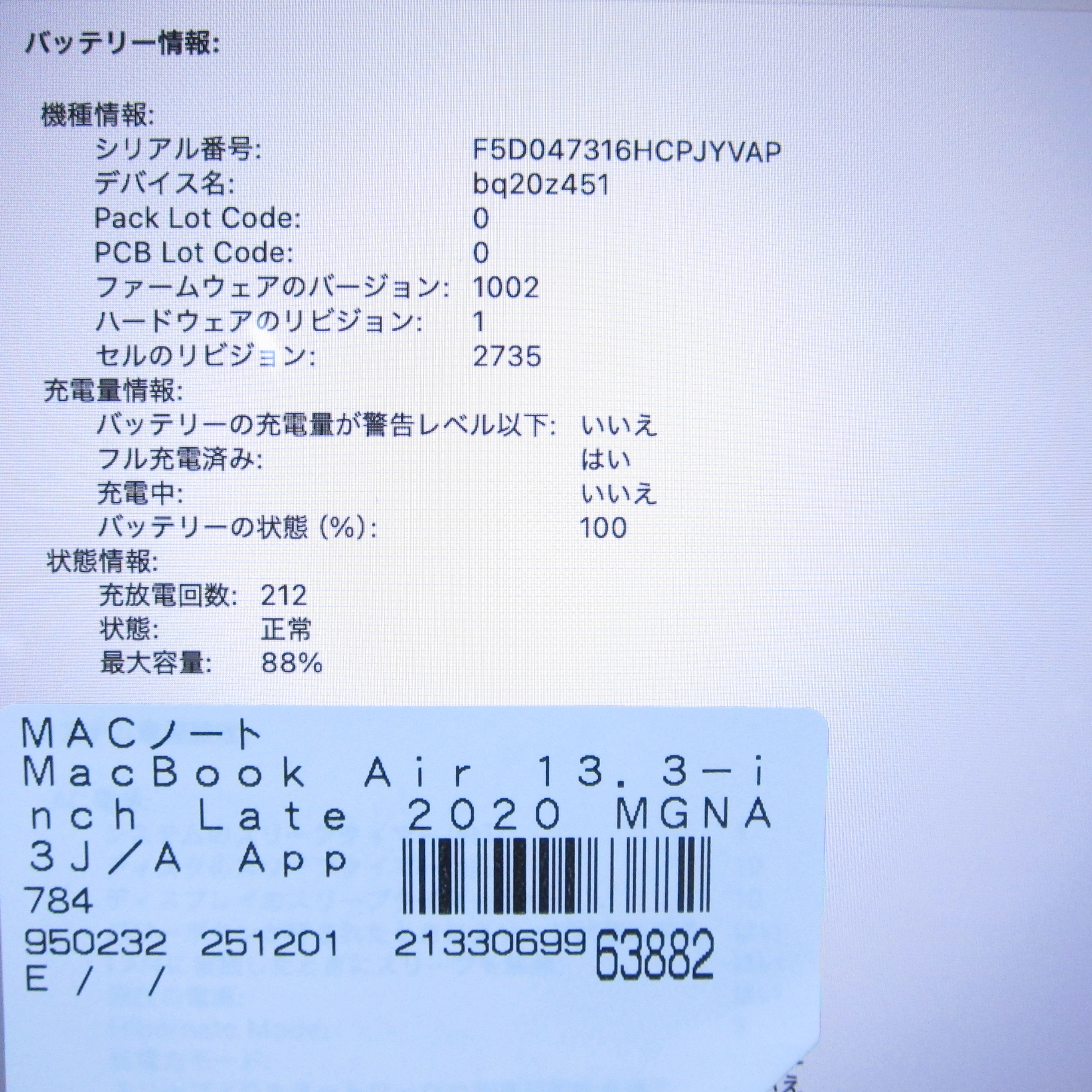 〔中古品〕 MacBook Air 13.3-inch Late-2020 MGNA3J/A Apple M1 8コアCPU_8コアGPU 8GB SSD1TB シルバー 〔15.3 Sequoia〕 [グラフィック:オンボード/JISキーボード]