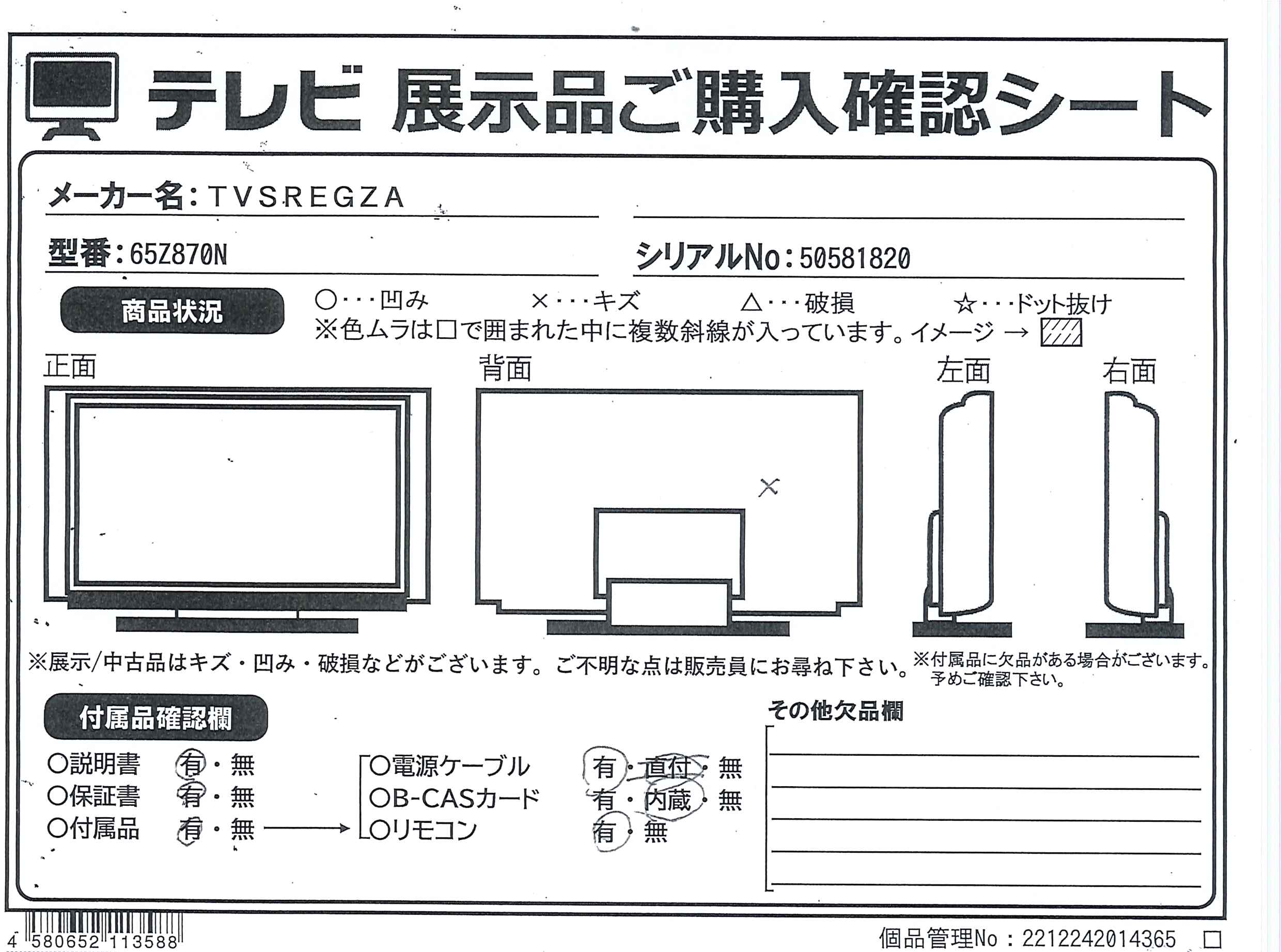 〔展示品〕 液晶テレビ REGZA(レグザ) 65Z870N [65V型 /Bluetooth対応 /4K対応 /BS・CS 4Kチューナー内蔵 /YouTube対応]