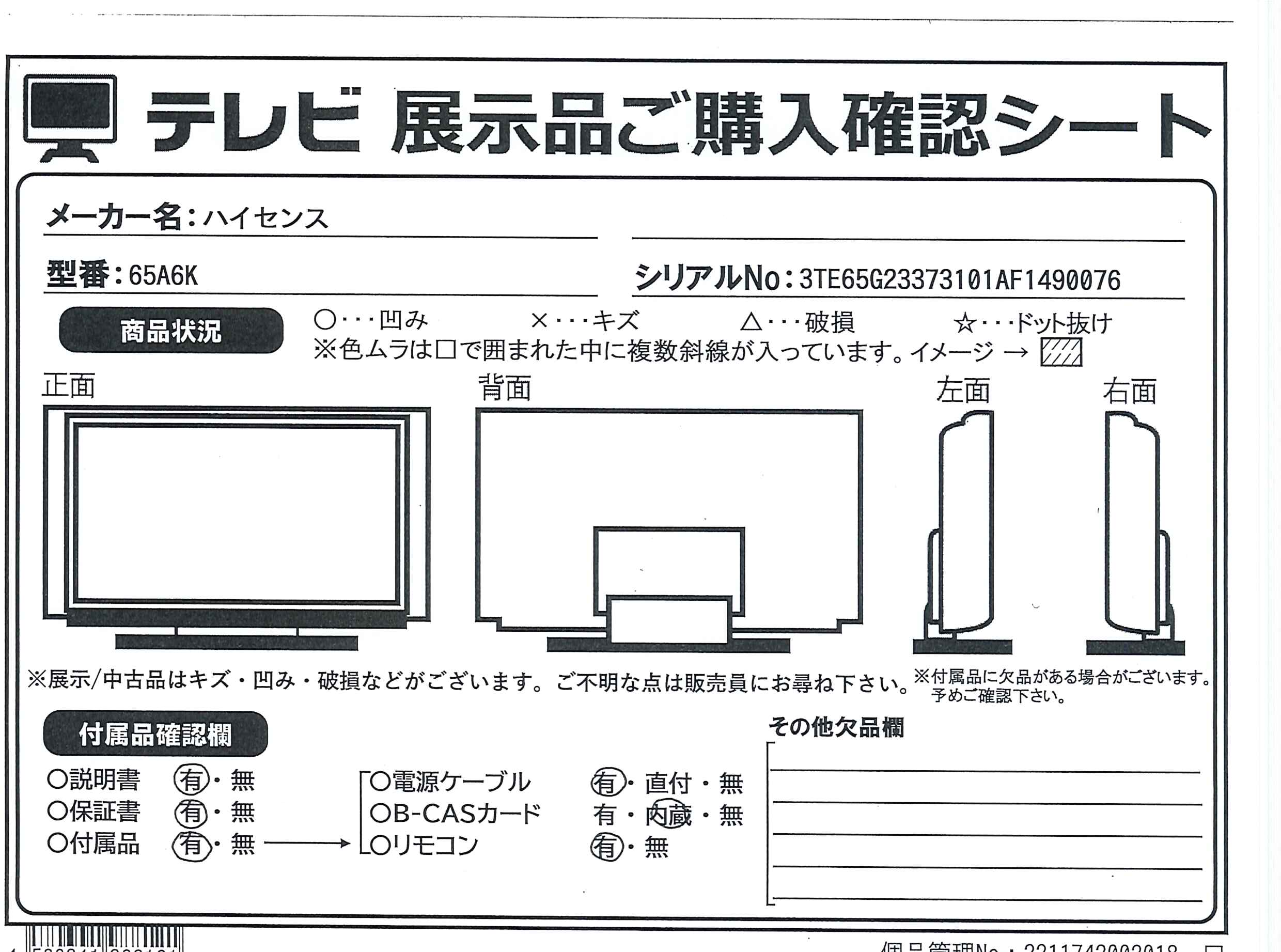 ▼同型番の新品商品はこちら![]() Hisense(ハイセンス) 液晶テレビ 65A6K [65V型 /Bluetooth対応 /4K対応 /BS・CS 4Kチューナー内蔵 /YouTube対応] ¥78,999(税込) 0ポイントサービス 在庫限り |