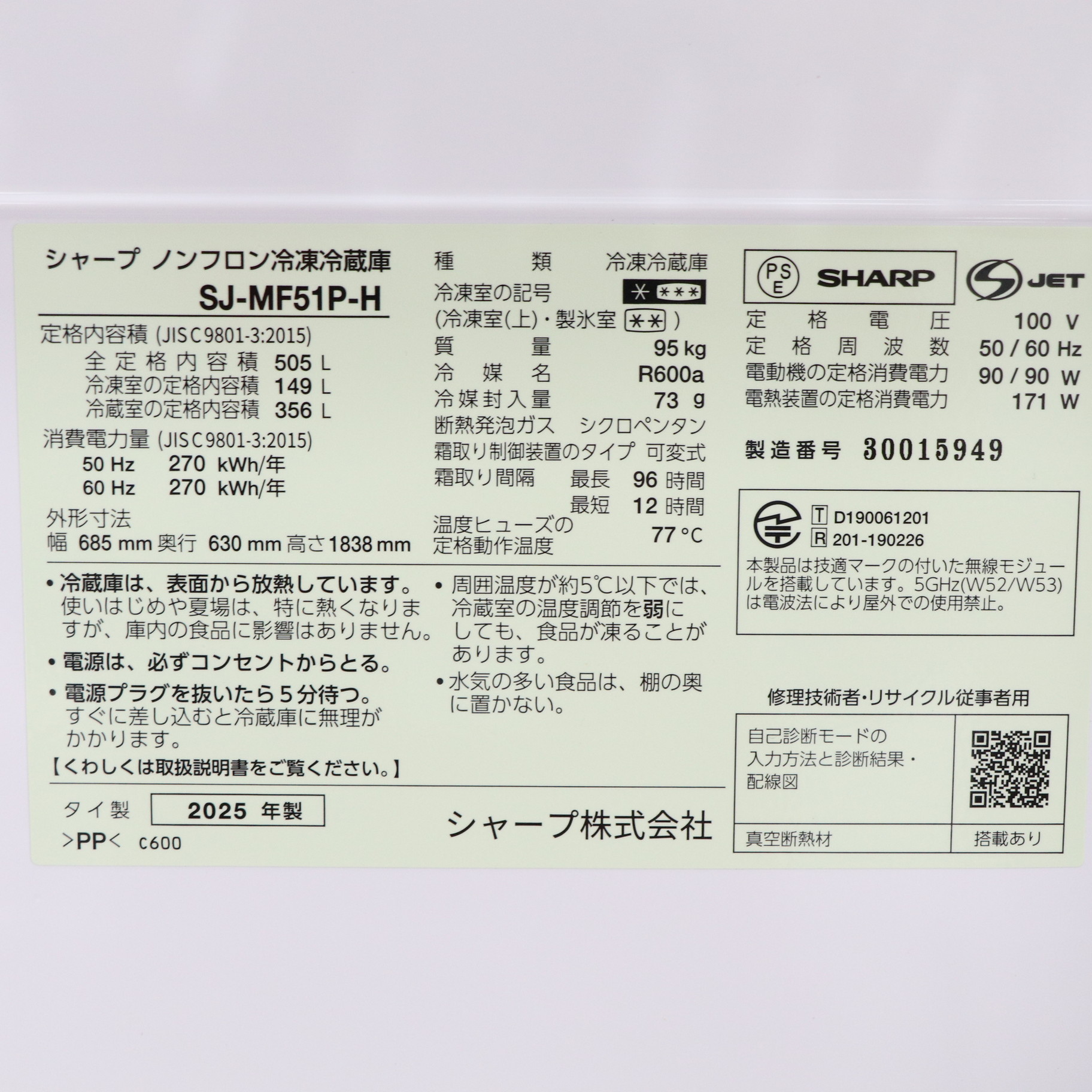 〔中古品〕 プラズマクラスター冷蔵庫 ダスクダークメタル SJ-MF51P-H [幅68.5cm /505L /6ドア /観音開きタイプ]