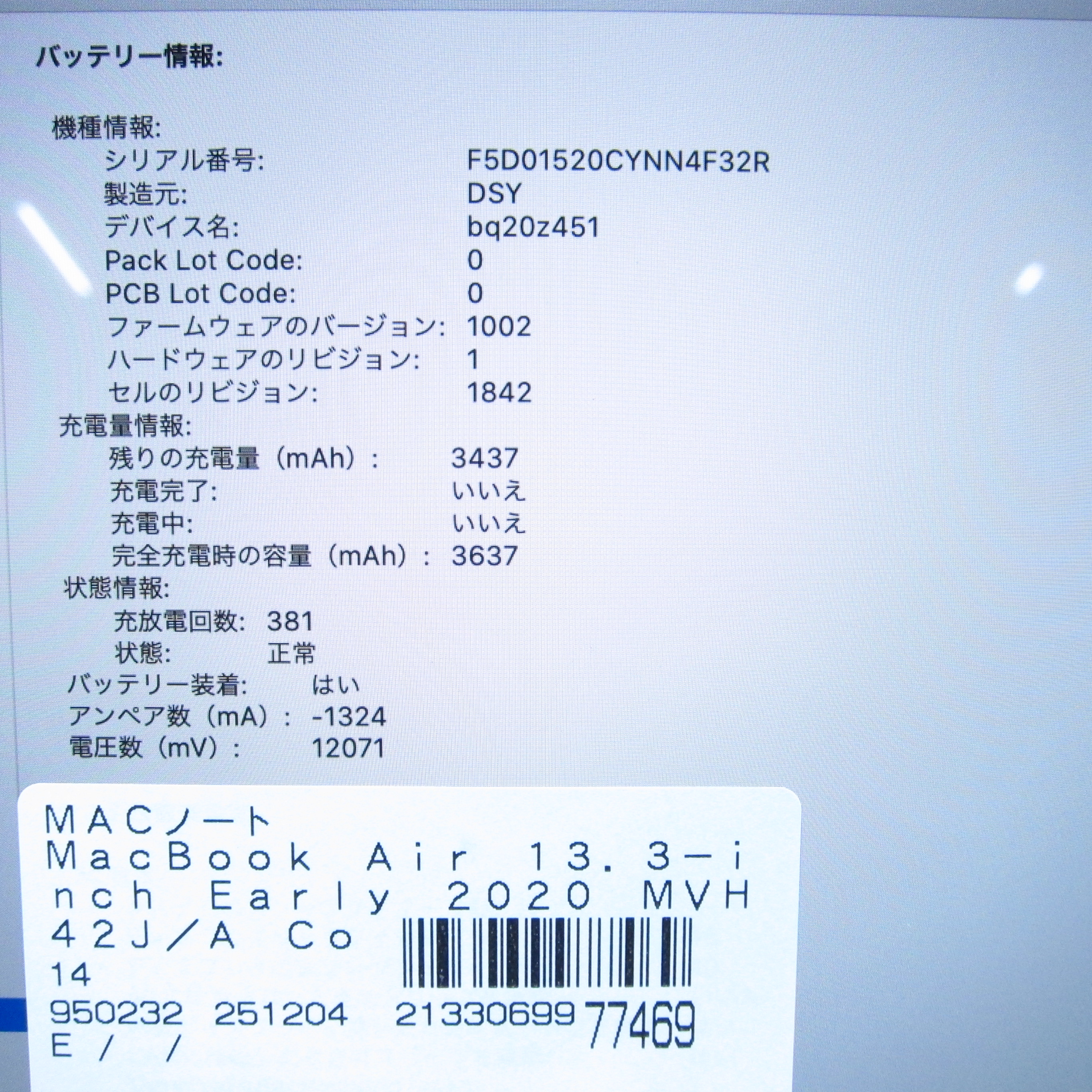 商品名 〔中古品〕 MacBook Air 13.3-inch Early-2020 MVH42J/A Core_i5 1.1GHz 8GB SSD512GB シルバー 〔10.15 Catalina〕 [グラフィック:Intel Iris Plus Graphics/JISキーボード]