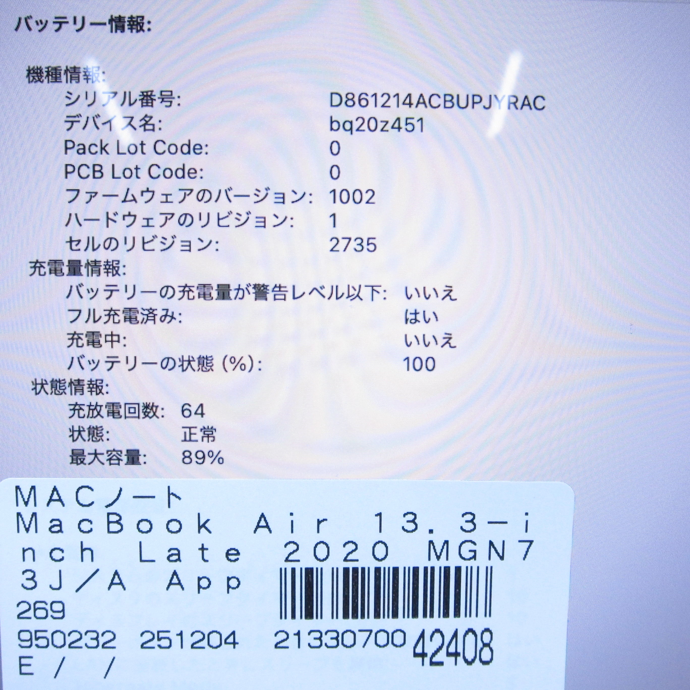 〔中古品〕 MacBook Air 13.3-inch Late-2020 MGN73J/A Apple M1 8コアCPU_8コアGPU 16GB SSD512GB スペースグレイ 〔15.3 Sequoia〕 [グラフィック:オンボード/JISキーボード]