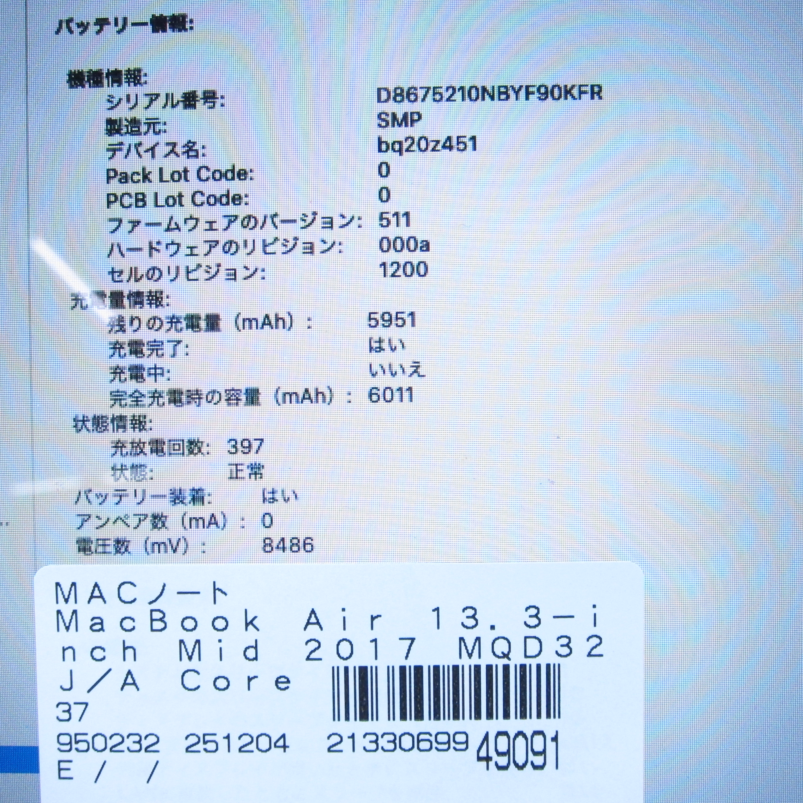 〔中古品〕 MacBook Air 13.3-inch Mid-2017 MQD32J/A Core_i5 1.8GHz 8GB SSD128GB 〔10.15 Catalina〕 [グラフィック:Intel HD Graphics 6000/JISキーボード]