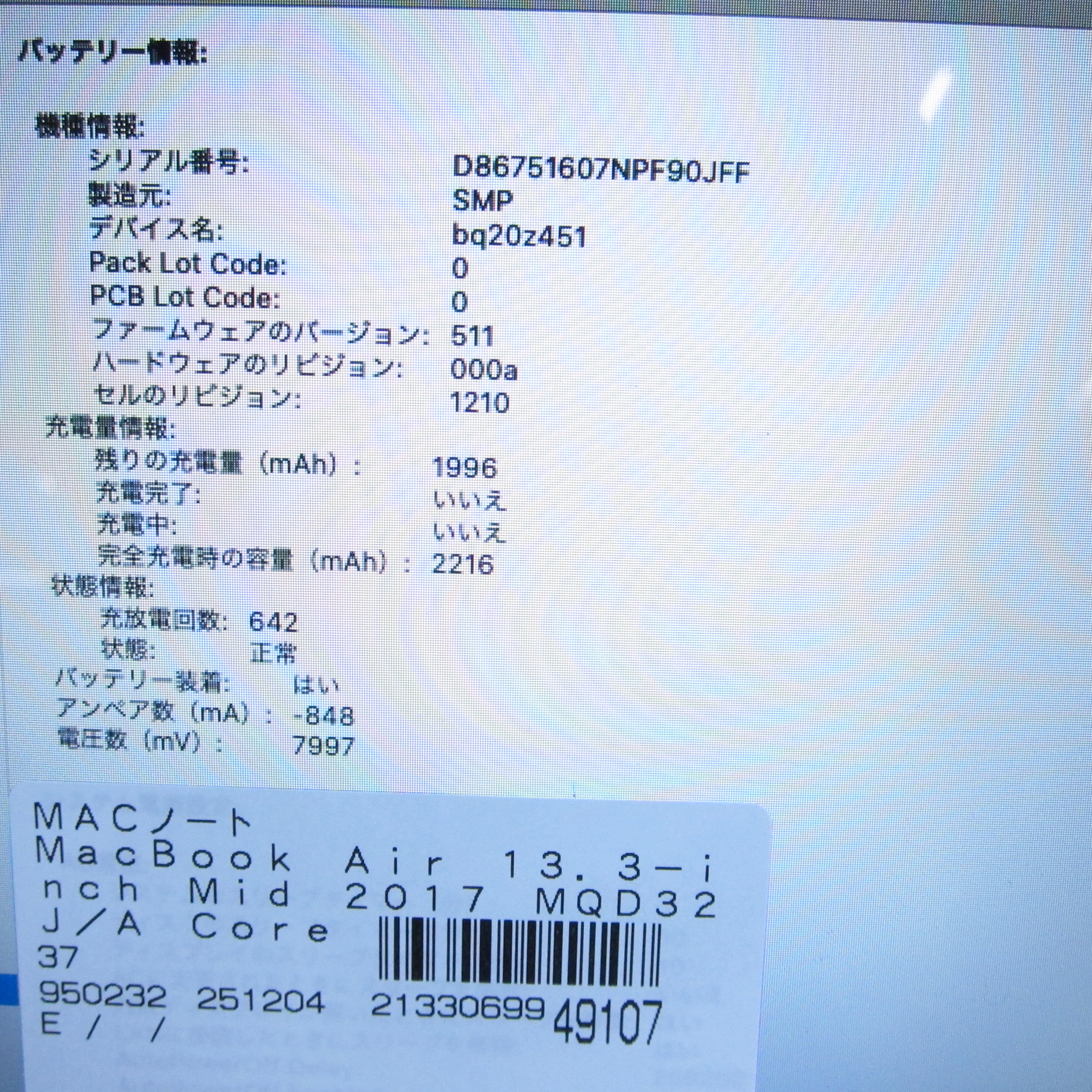 〔中古品(難あり)〕 MacBook Air 13.3-inch Mid-2017 MQD32J/A Core_i5 1.8GHz 8GB SSD128GB 〔10.15 Catalina〕 [グラフィック:Intel HD Graphics 6000/JISキーボード]