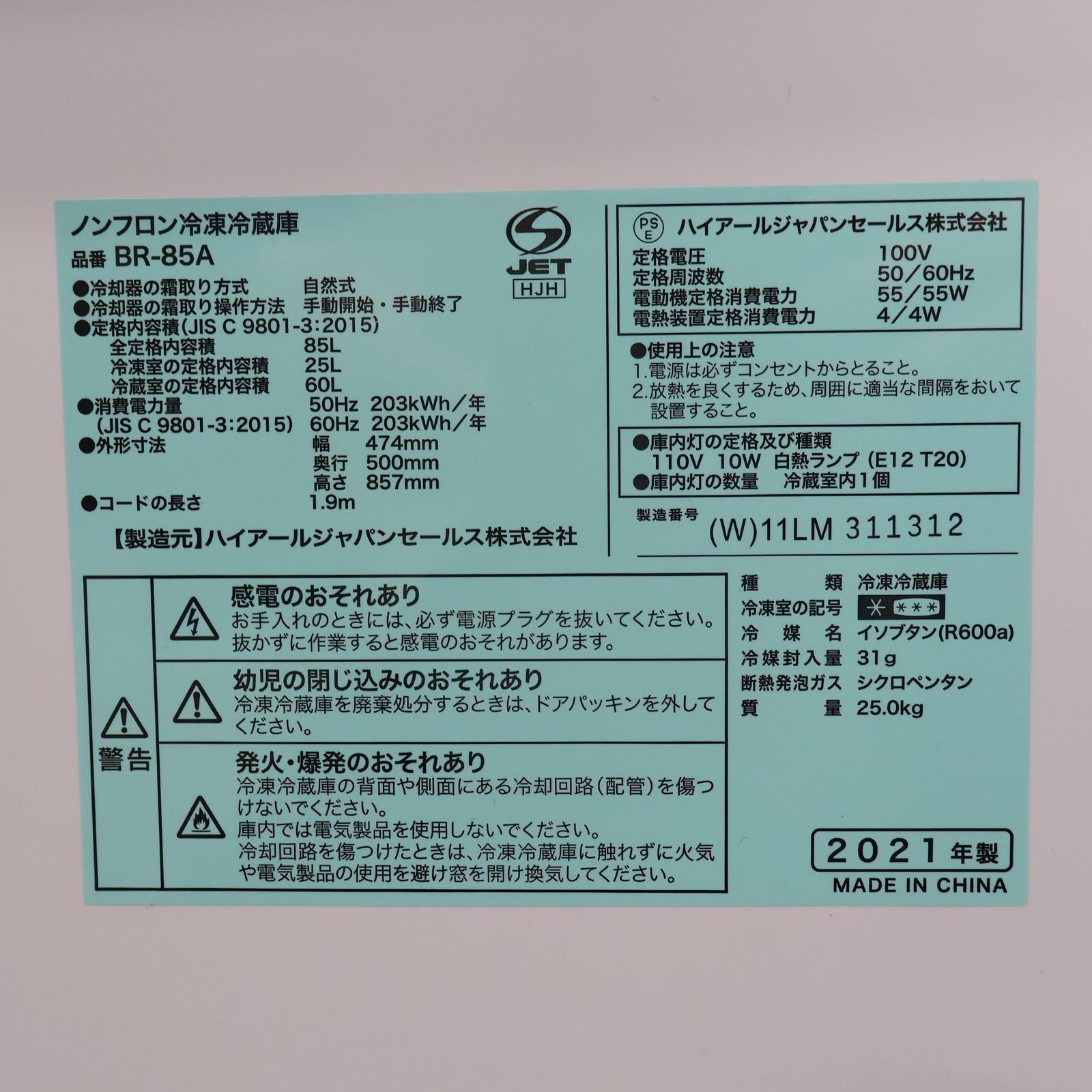 〔中古品〕 冷蔵庫 ホワイト BR-85A-W [幅47.4cm /85L /2ドア /右開きタイプ /2021年]