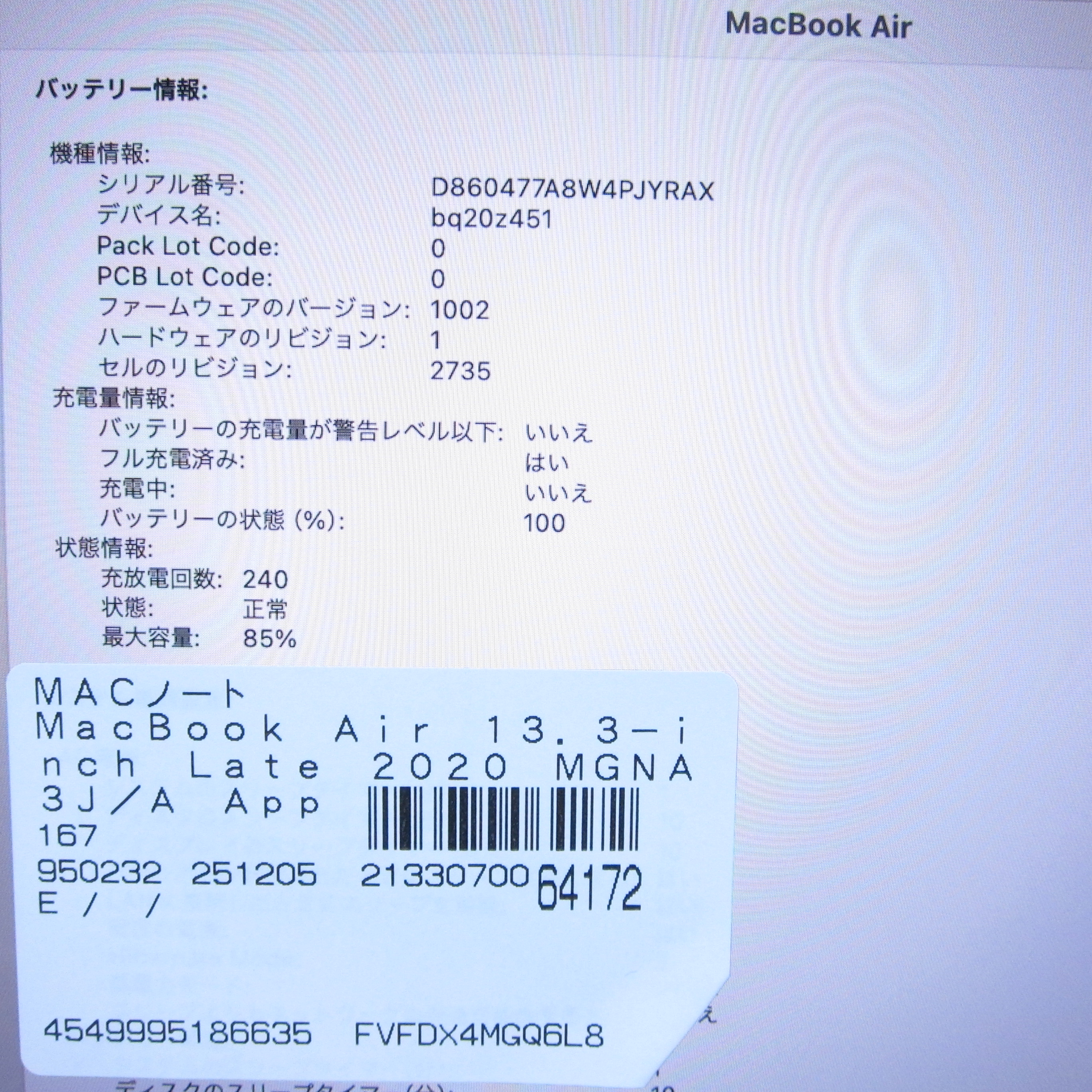 〔中古品〕 MacBook Air 13.3-inch Late-2020 MGNA3J/A Apple M1 8コアCPU_8コアGPU 8GB SSD512GB シルバー 〔14.7 Sonoma〕 [グラフィック:オンボード/JISキーボード]