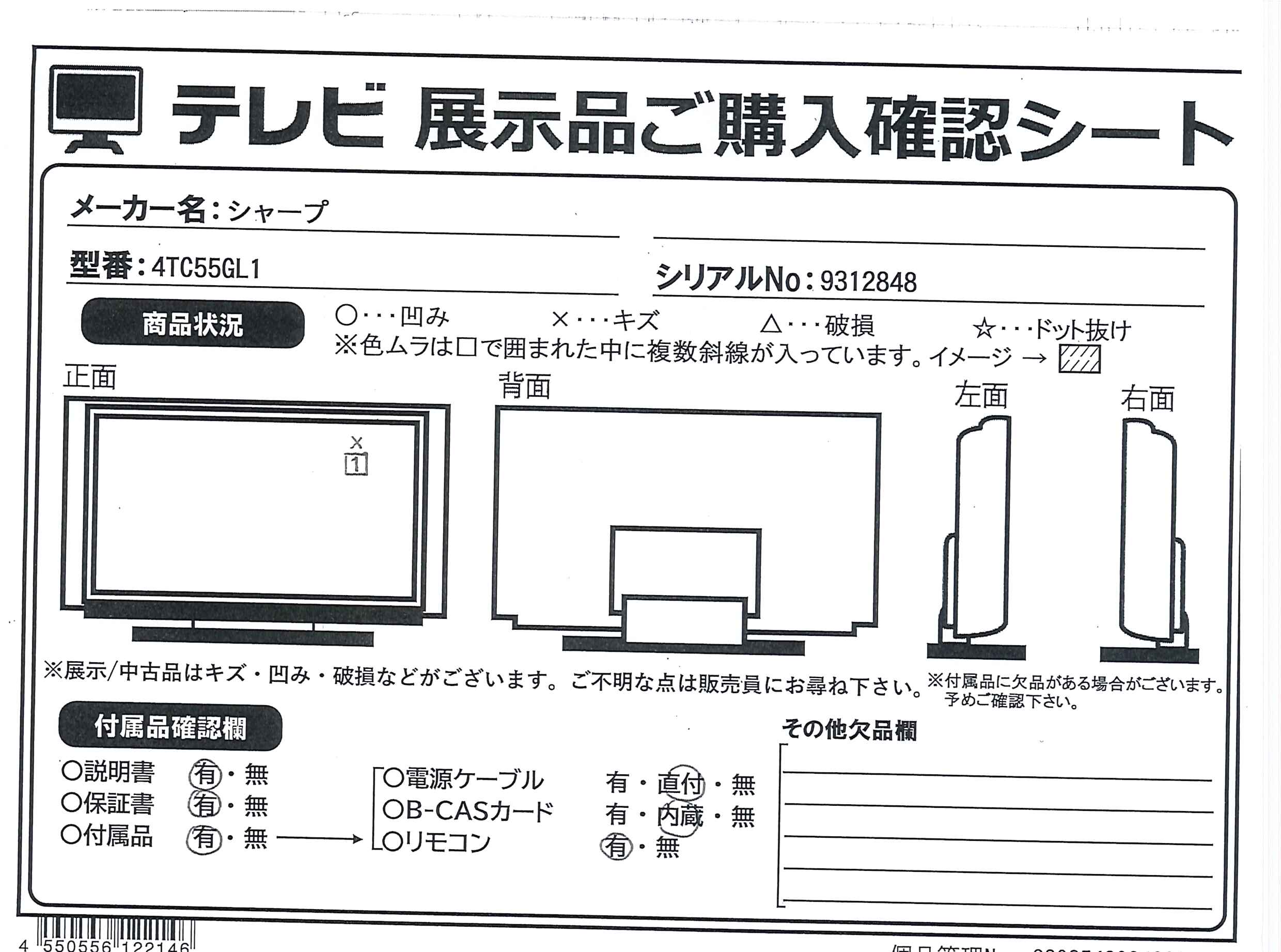 中古商品ランクについて 付属品・商品状態について 〔付属品〕取扱説明書、リモコン、単4形乾電池×2、スタンド(L)、スタンド(R)、スタンド取付用ネジ(M4×12mm)×4、転倒防止ベルト×2、転倒防止ベルトテレビ取付用ネジ(黒:M4×16mm)×2、転倒防止ベルトテレビ台固定用ネジ(シルバー:M4×16mm)×2