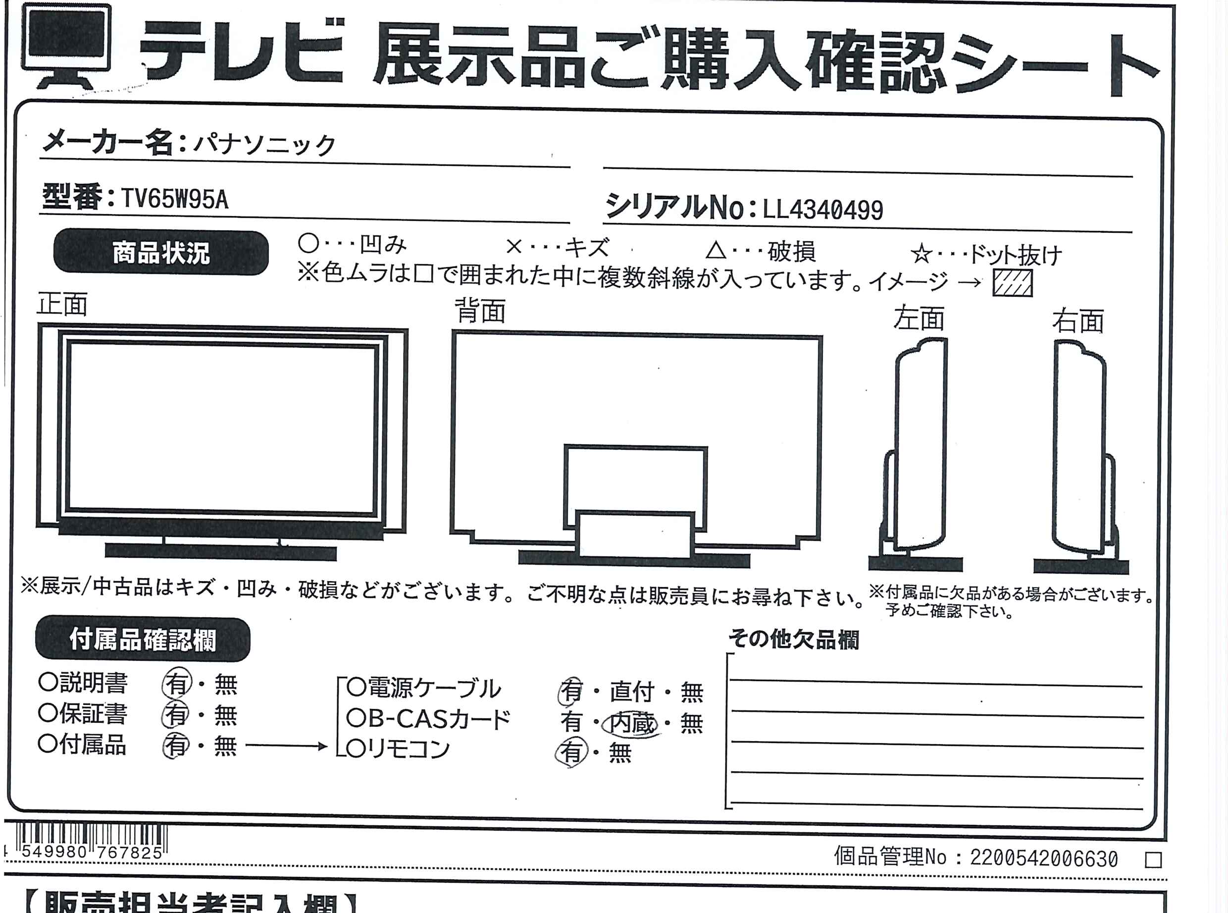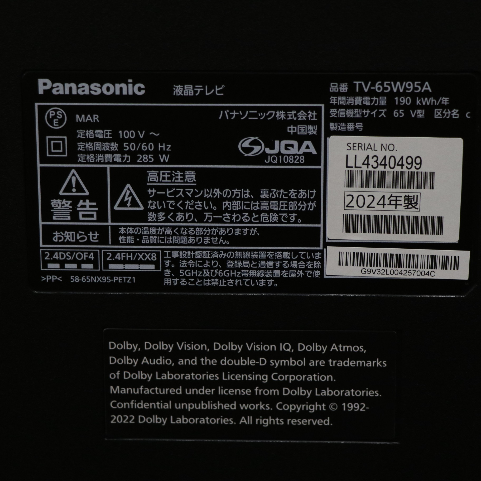 〔展示品〕 液晶テレビ VIERA(ビエラ) TV-65W95A [65V型 /Bluetooth対応 /4K対応 /YouTube対応]