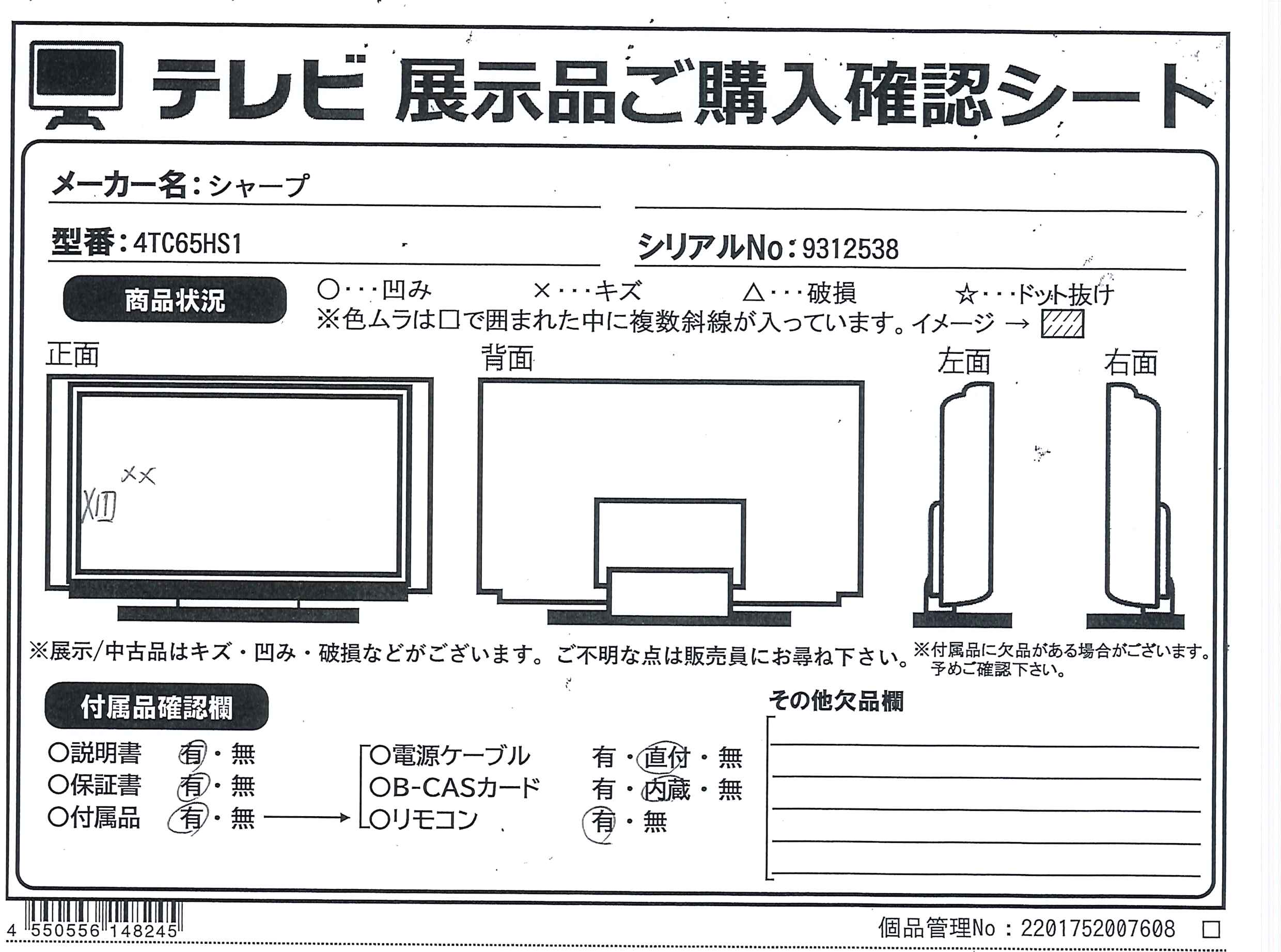 ▼同型番の新品商品はこちら![]() SHARP(シャープ) 有機ELテレビ AQUOS 4T-C65HS1 [65V型 /Bluetooth対応 /4K対応 /BS・CS 4Kチューナー内蔵 /YouTube対応] ¥385,002(税込) 0ポイントサービス 在庫あり |