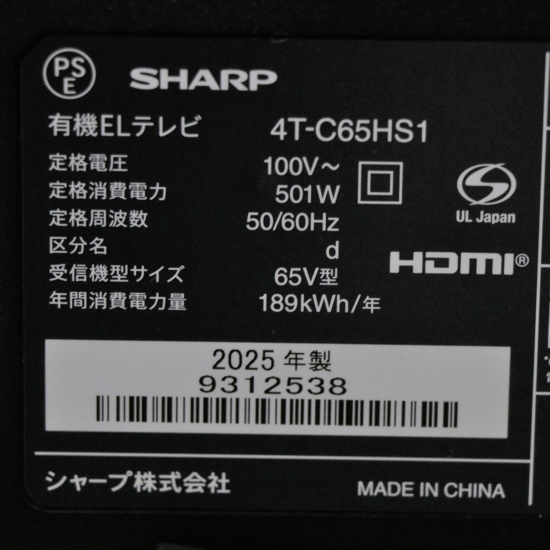 〔展示品〕 有機ELテレビ AQUOS 4T-C65HS1 [65V型 /Bluetooth対応 /4K対応 /BS・CS 4Kチューナー内蔵 /YouTube対応]