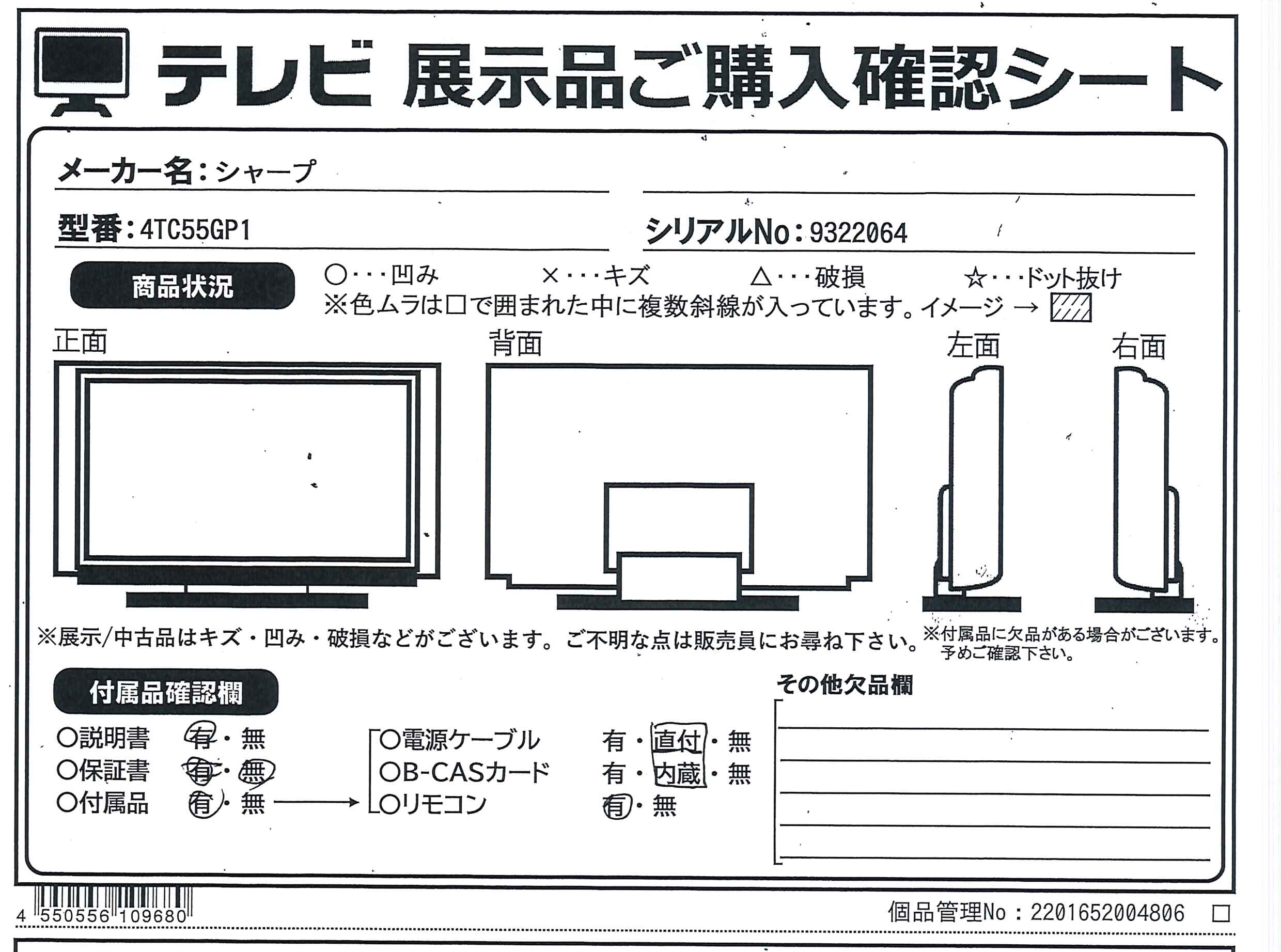 ▼同型番の新品商品はこちら![]() SHARP(シャープ) 液晶テレビ AQUOS ブラック 4T-C55GP1 [55V型 /Bluetooth対応 /4K対応 /BS・CS 4Kチューナー内蔵 /YouTube対応] ¥198,000(税込) 0ポイントサービス 在庫限り |