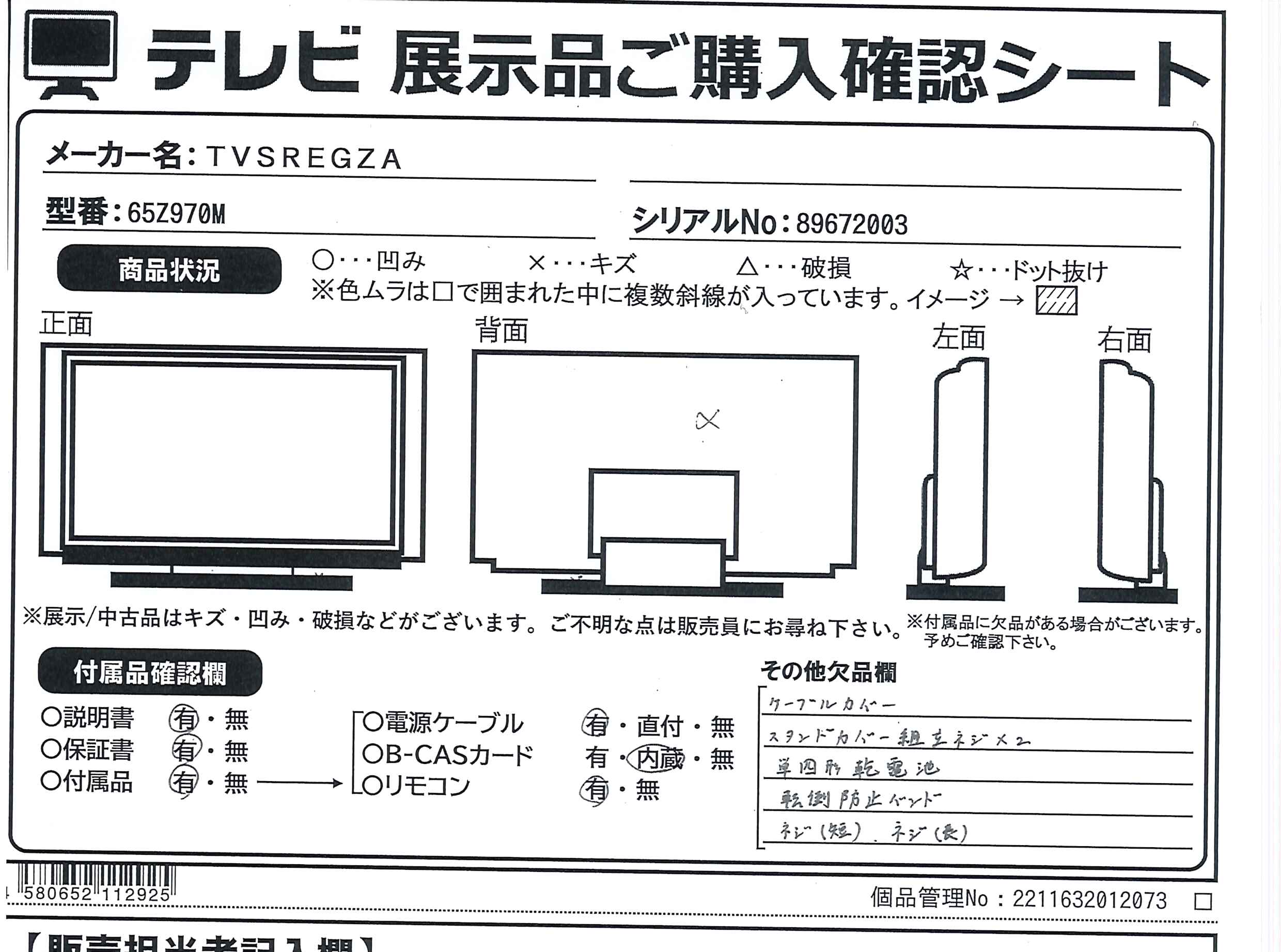 中古商品ランクについて 付属品・商品状態について 〔付属品〕説明書、スタンド支柱、スタンドベース、スタンド組立ネジ×4、スタンド取付ネジ×4、スタンドカバー、リモコン、電源コード