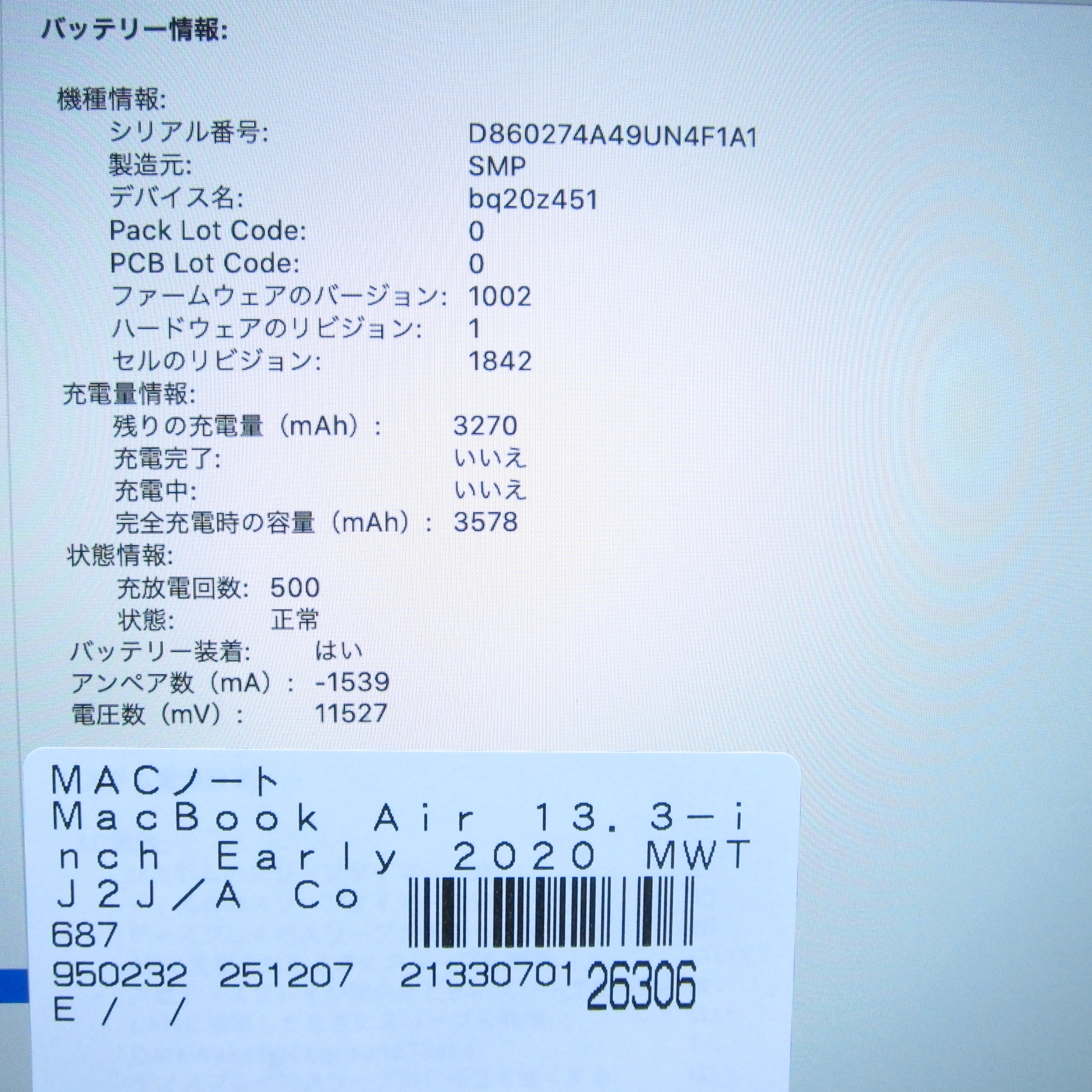 〔中古品〕 MacBook Air 13.3-inch Early-2020 MWTJ2J/A Core_i5 1.1GHz 16GB SSD256GB スペースグレイ 〔10.15 Catalina〕 [グラフィック:Intel Iris Plus Graphics/JISキーボード]