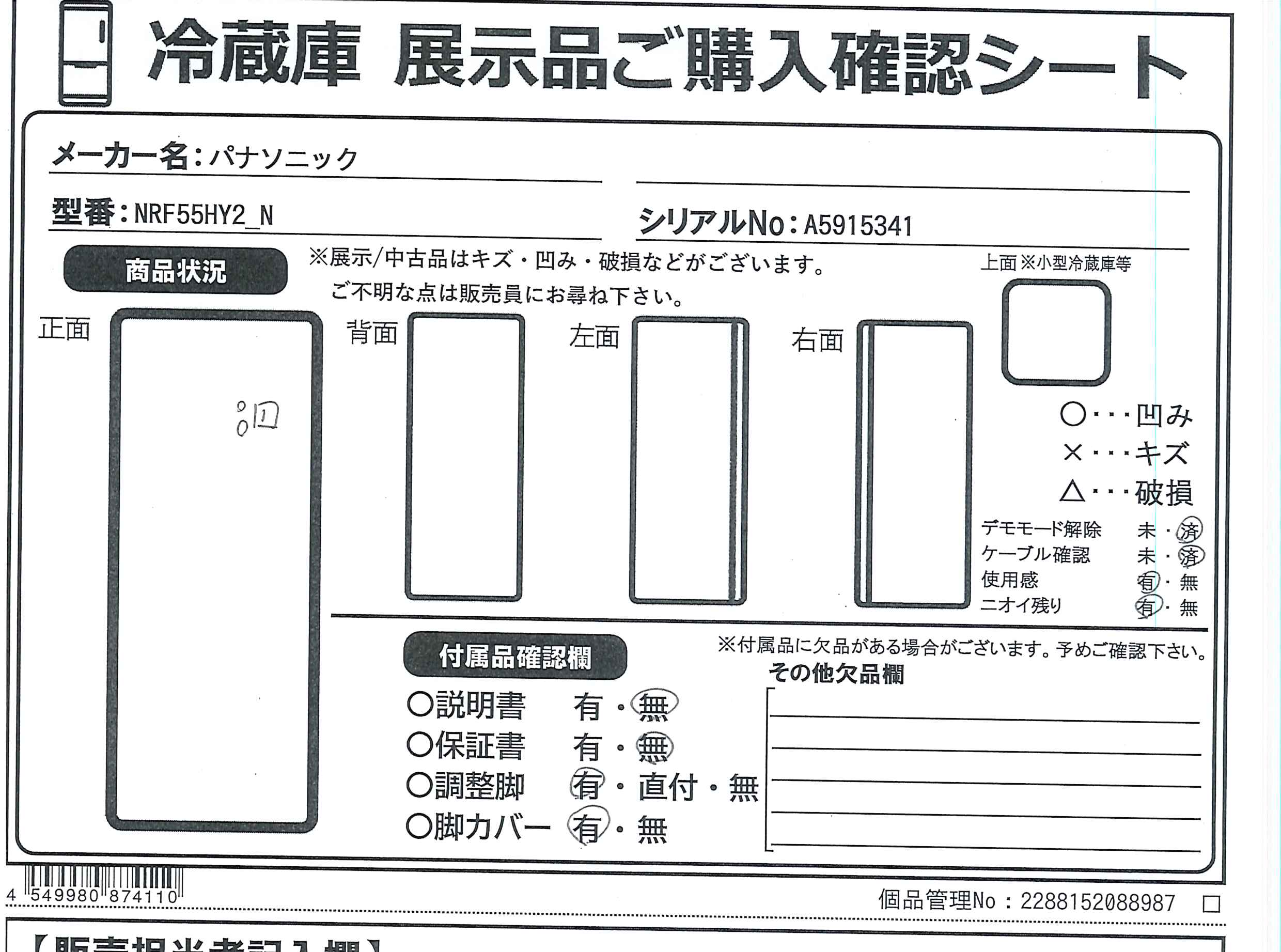 中古商品ランクについて 付属品・商品状態について 〔付属品〕説明書、調節脚×2、脚カバー、給水タンク、貯氷ケース、製氷皿、アイスシャベル、卵トレイ、アルミプレート(チルド)、アルミプレート(クーリングアシストルーム)