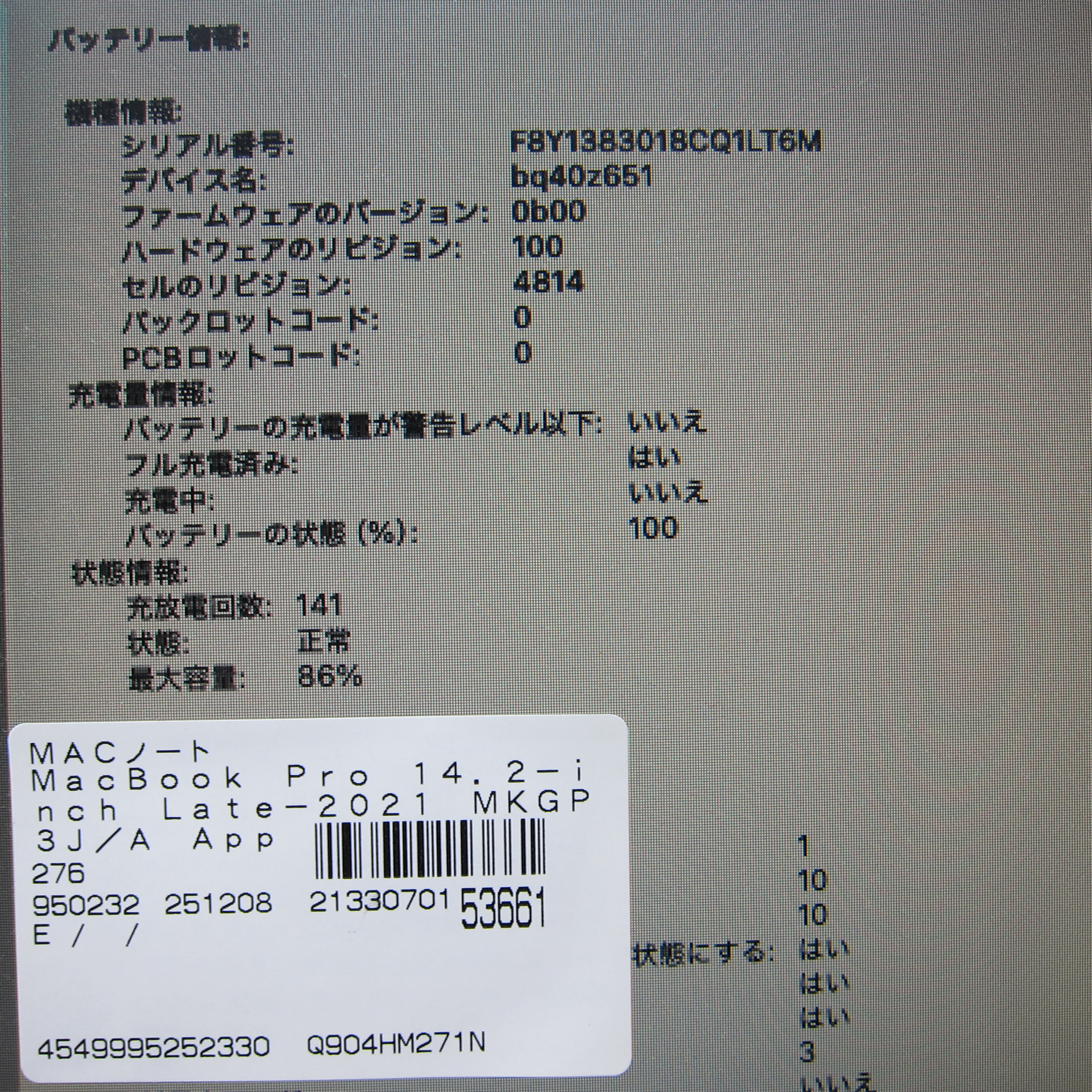 〔ジャンク品〕 MacBook Pro 14.2-inch Late-2021 MKGP3J/A Apple M1 Pro 8コアCPU_14コアGPU 16GB SSD512GB スペースグレイ 〔26.1 Tahoe〕 [グラフィック:オンボード/JISキーボード]
