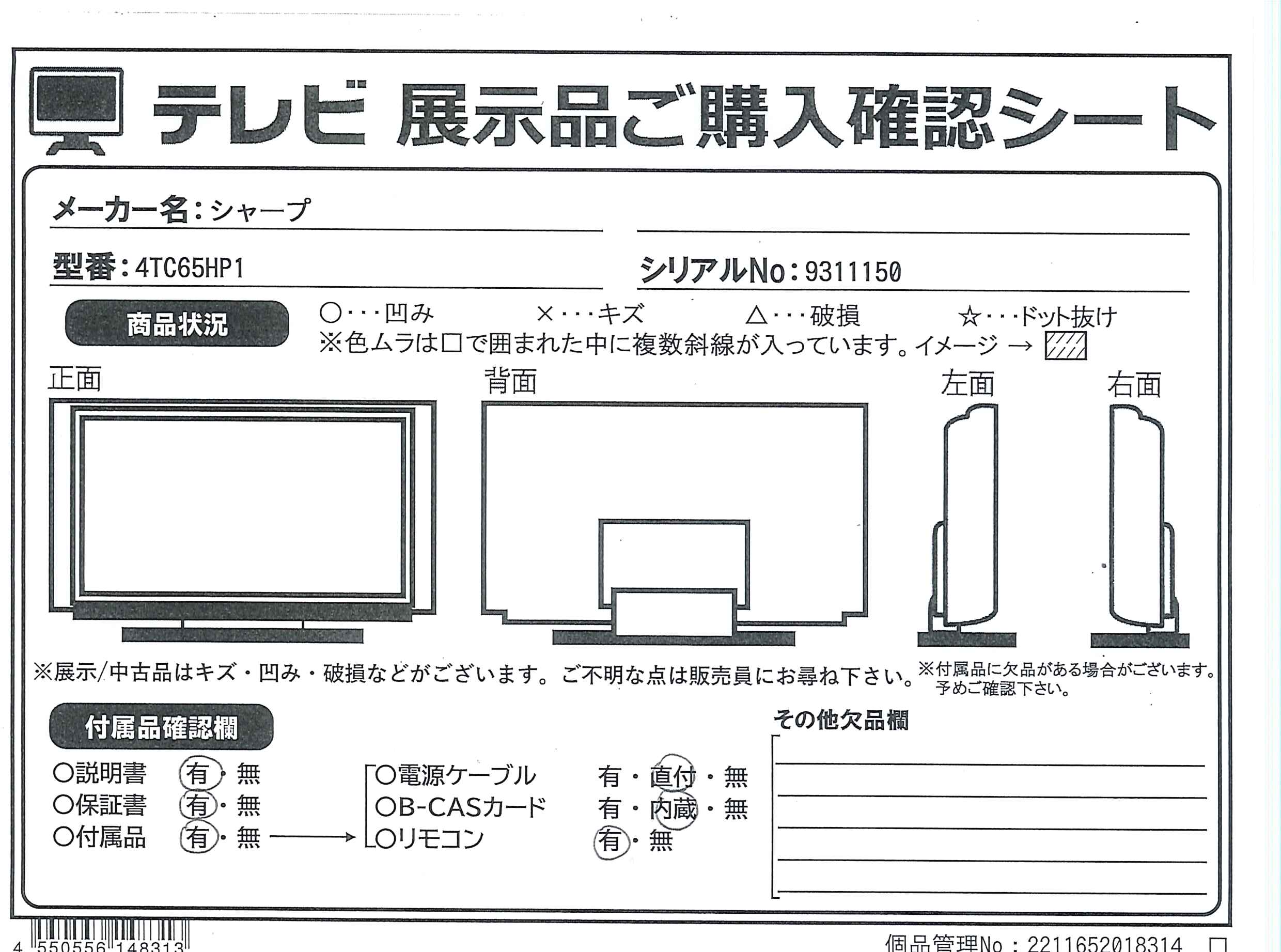 ![SHARP(シャープ) 液晶テレビ AQUOS 4T-C65HP1 [65V型 /Bluetooth対応 /4K対応 /BS・CS 4Kチューナー内蔵 /YouTube対応]](https://image.sofmap.com/images/product/large/4550556148313.jpg)