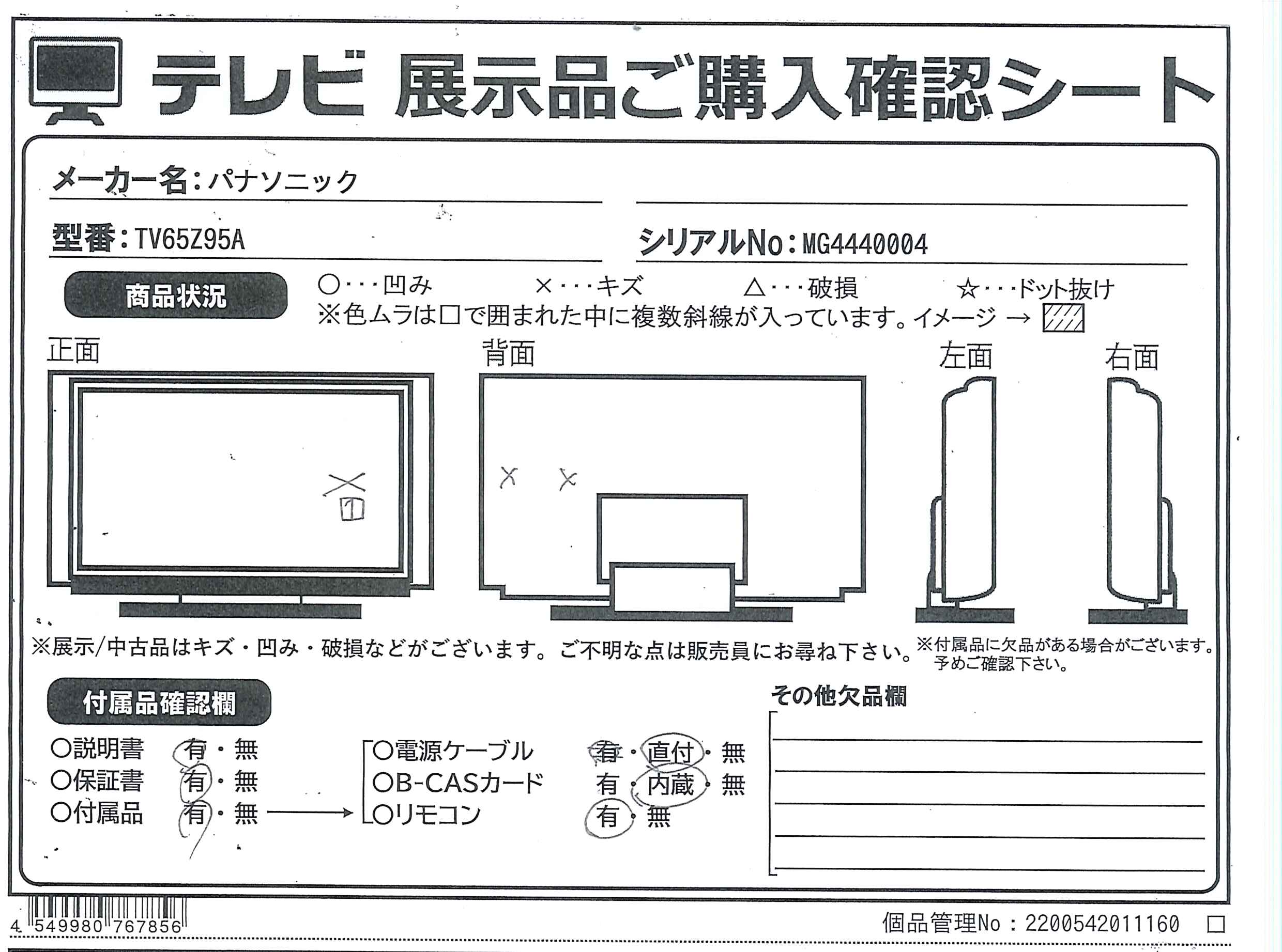 中古商品ランクについて 付属品・商品状態について 〔付属品〕説明書、リモコン、リモコン用乾電池×2、スタンド一式、ケーブルカバー、転倒・落下防止部品一式