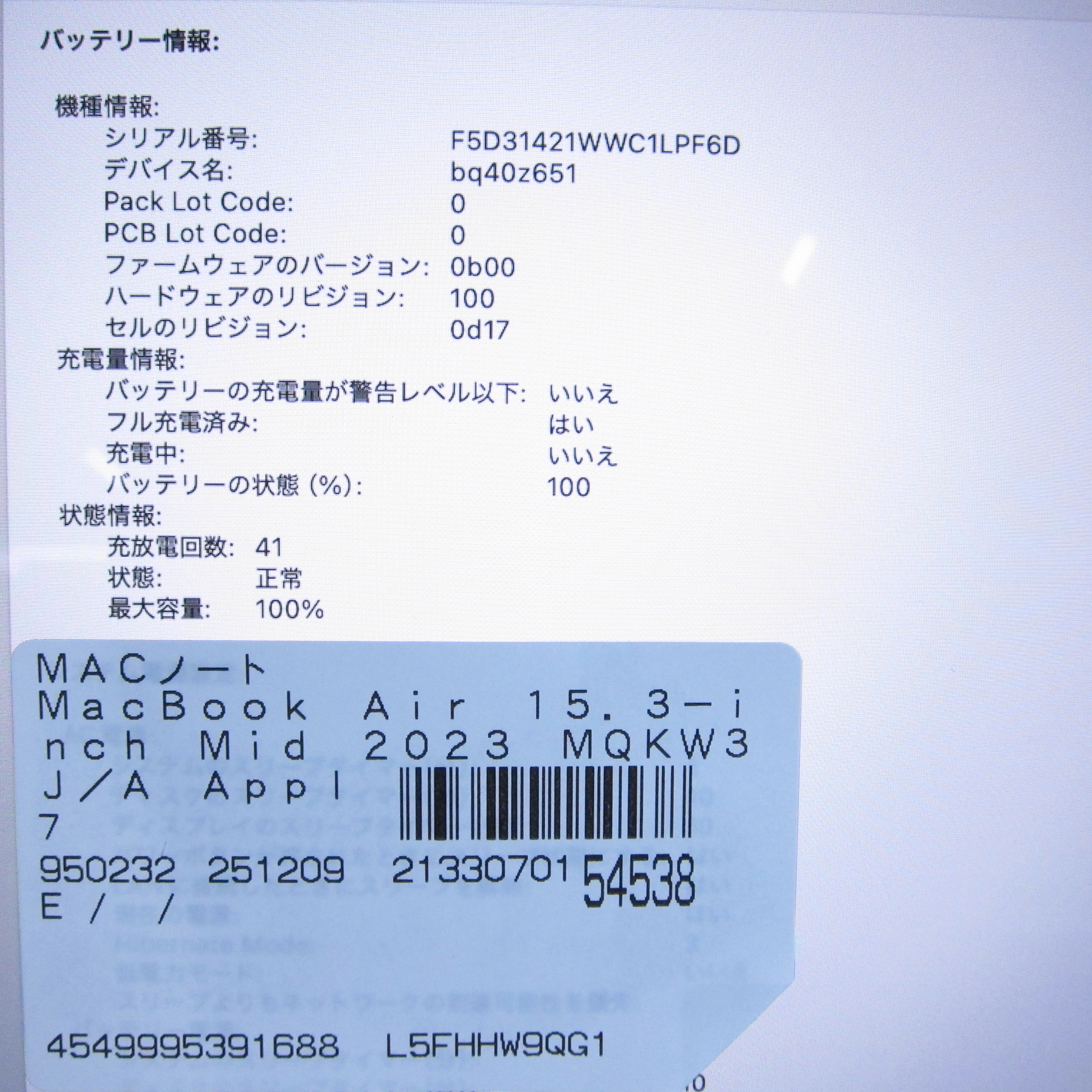 〔中古品〕 MacBook Air 15.3-inch Mid-2023 MQKW3J/A Apple M2 8コアCPU_10コアGPU 8GB SSD256GB ミッドナイト 〔15.3 Sequoia〕 [グラフィック:オンボード/JISキーボード]