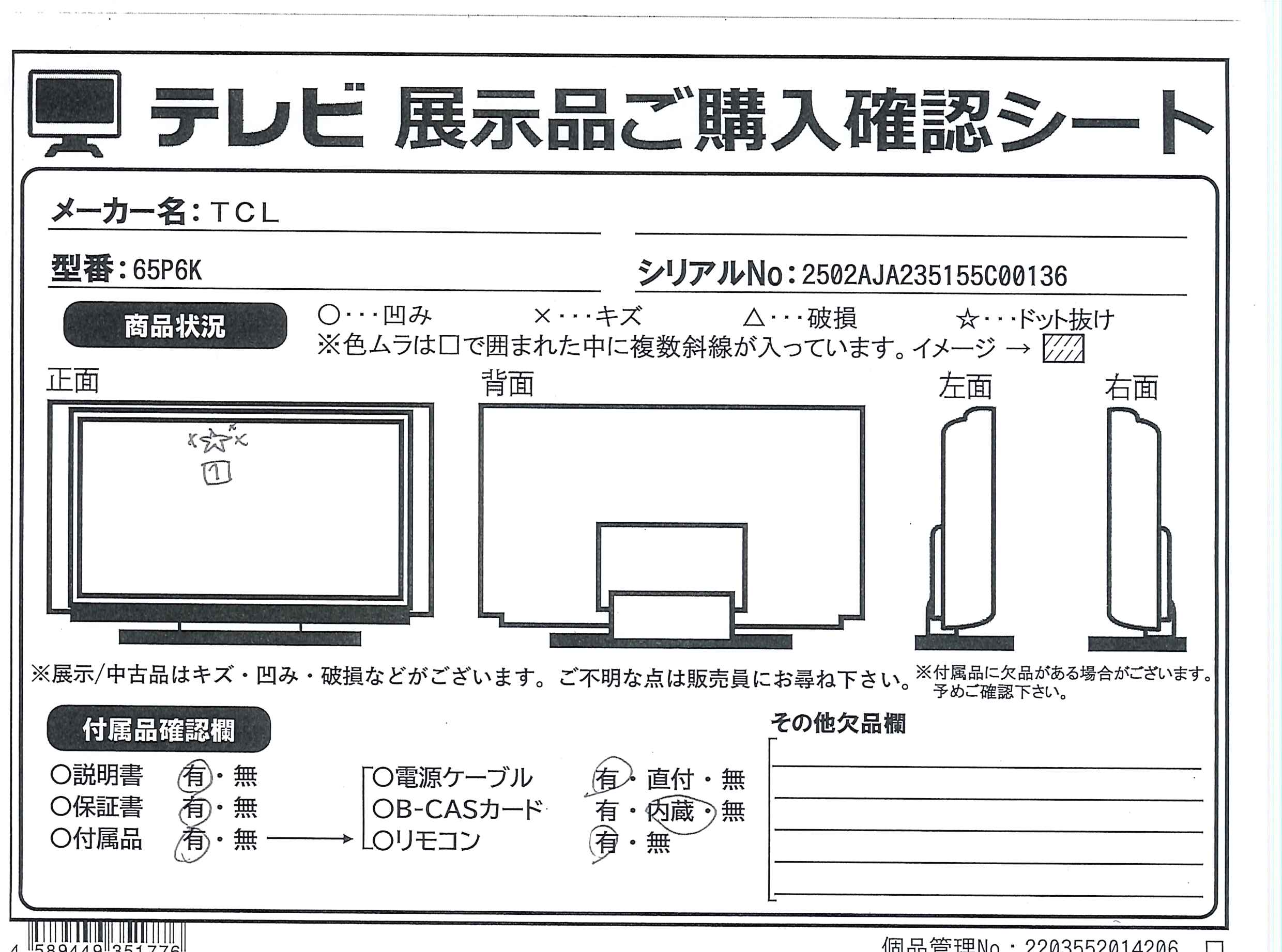 中古商品ランクについて 付属品・商品状態について 〔付属品〕リモコン、単四形乾電池X2、電源コード、スタンドX2、スタンド取付ネジX4、マジックテープX2、VESAネジX2、ネジ(ST4)(20mm)、クリップX3、説明書、かんたんガイド