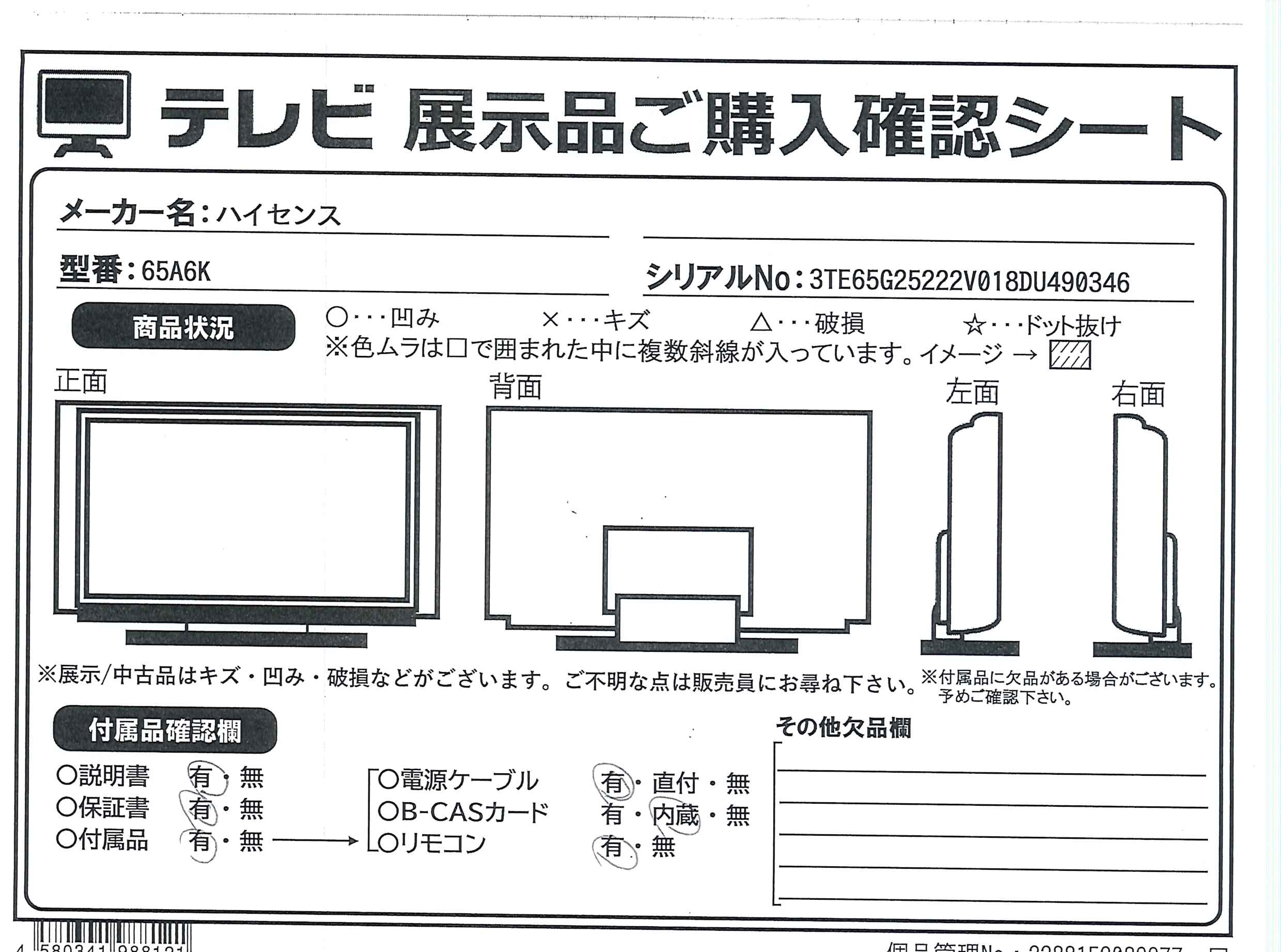 ▼同型番の新品商品はこちら![]() Hisense(ハイセンス) 液晶テレビ 65A6K [65V型 /Bluetooth対応 /4K対応 /BS・CS 4Kチューナー内蔵 /YouTube対応] ¥78,999(税込) 0ポイントサービス 在庫限り |