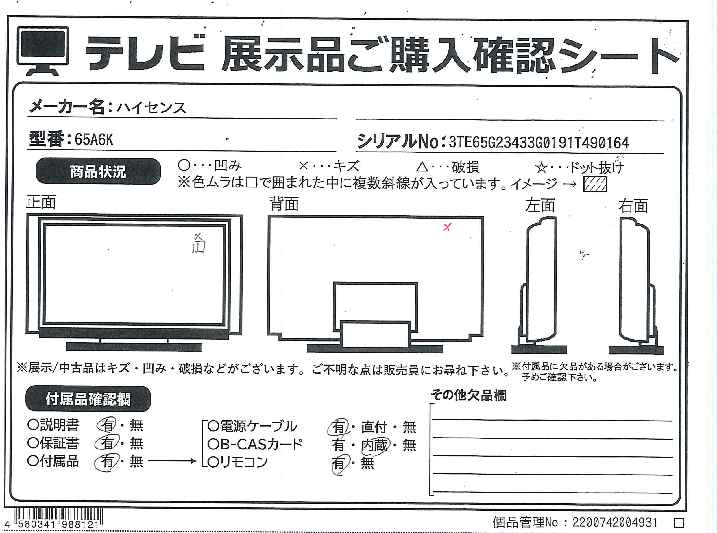 ▼同型番の新品商品はこちら![]() Hisense(ハイセンス) 液晶テレビ 65A6K [65V型 /Bluetooth対応 /4K対応 /BS・CS 4Kチューナー内蔵 /YouTube対応] ¥69,800(税込) 6,980ポイントサービス 在庫限り |