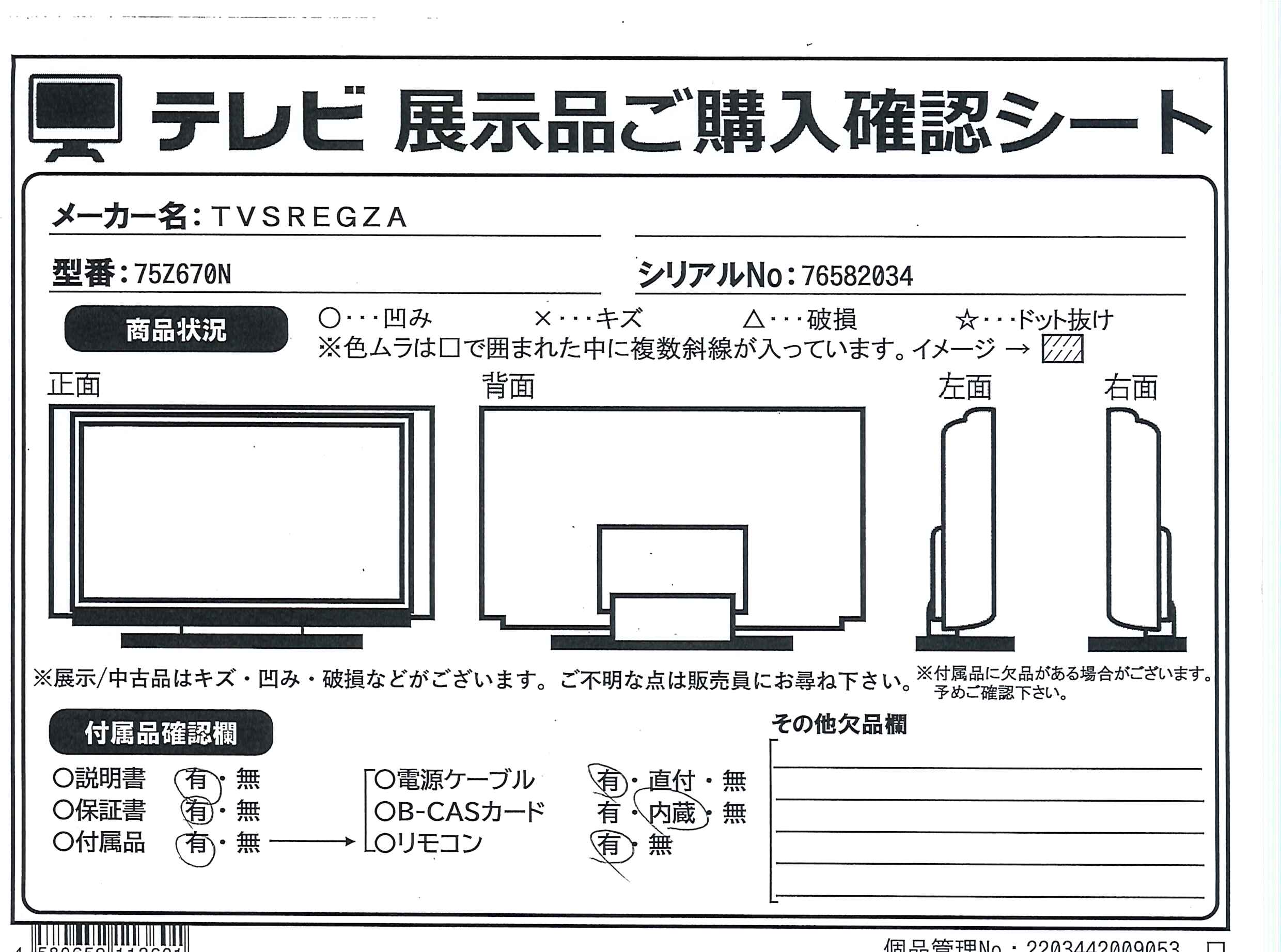 中古商品ランクについて 付属品・商品状態について 〔付属品〕説明書、スタンド2個、スタンドカバー2個、スタンド取付ネジ(M5ネジ)4本、リモコン、単四形乾電池×2、電源コード、転倒防止バンド×2、ネジ(長)×2、ネジ(短)×2