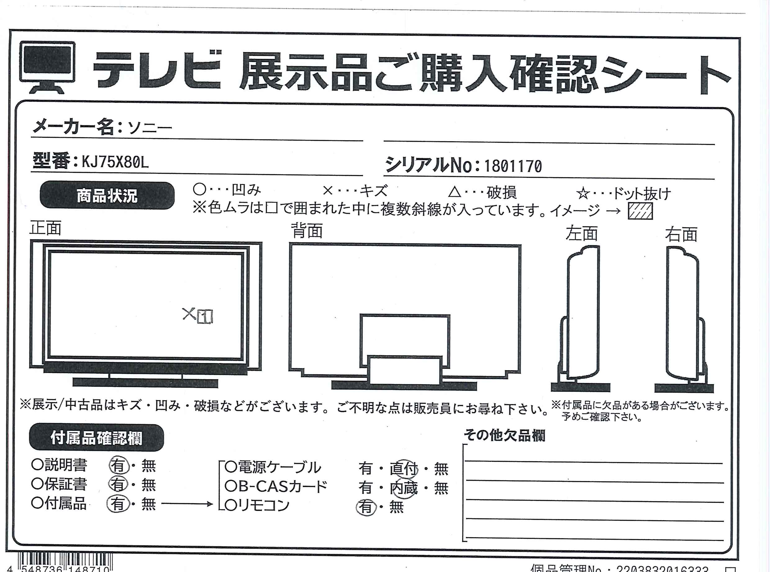 中古商品ランクについて 付属品・商品状態について 〔付属品〕説明書、組み立て/設置ガイド、GoogleTVセットアップガイド、製品登録のおすすめ、リモコン、リモコン用乾電池×2、スペーサー(VS)×4、スタンド一式、転倒防止部品一式、ケーブルクリップ(CL)×2