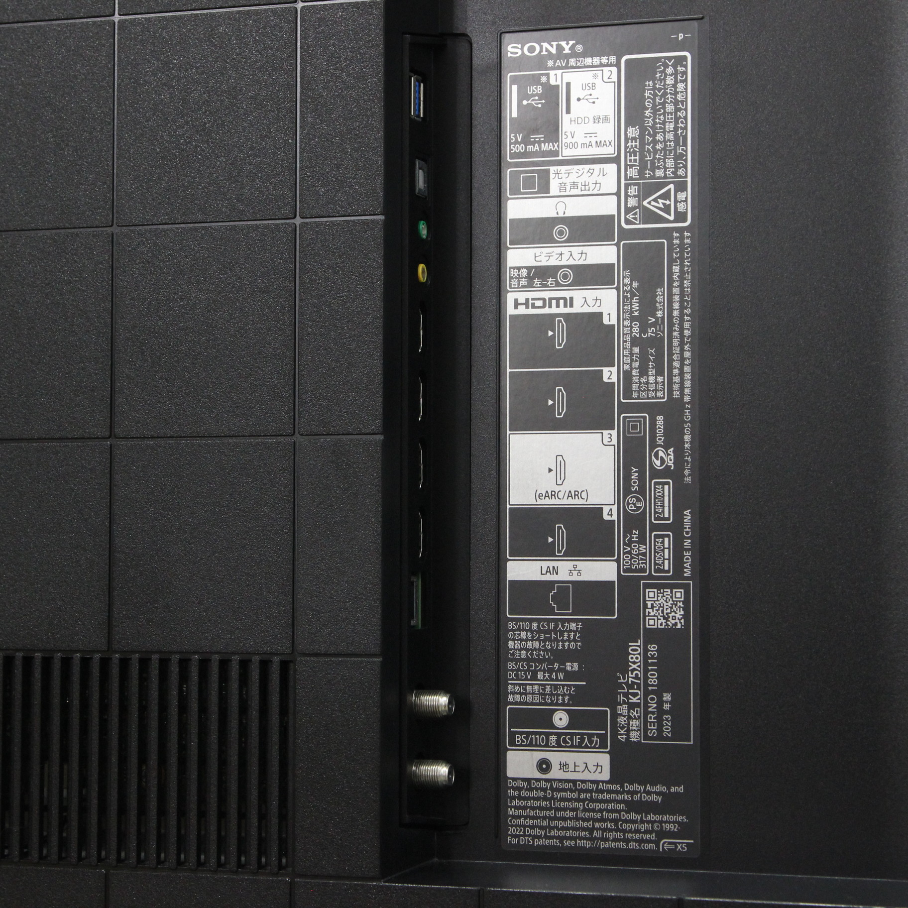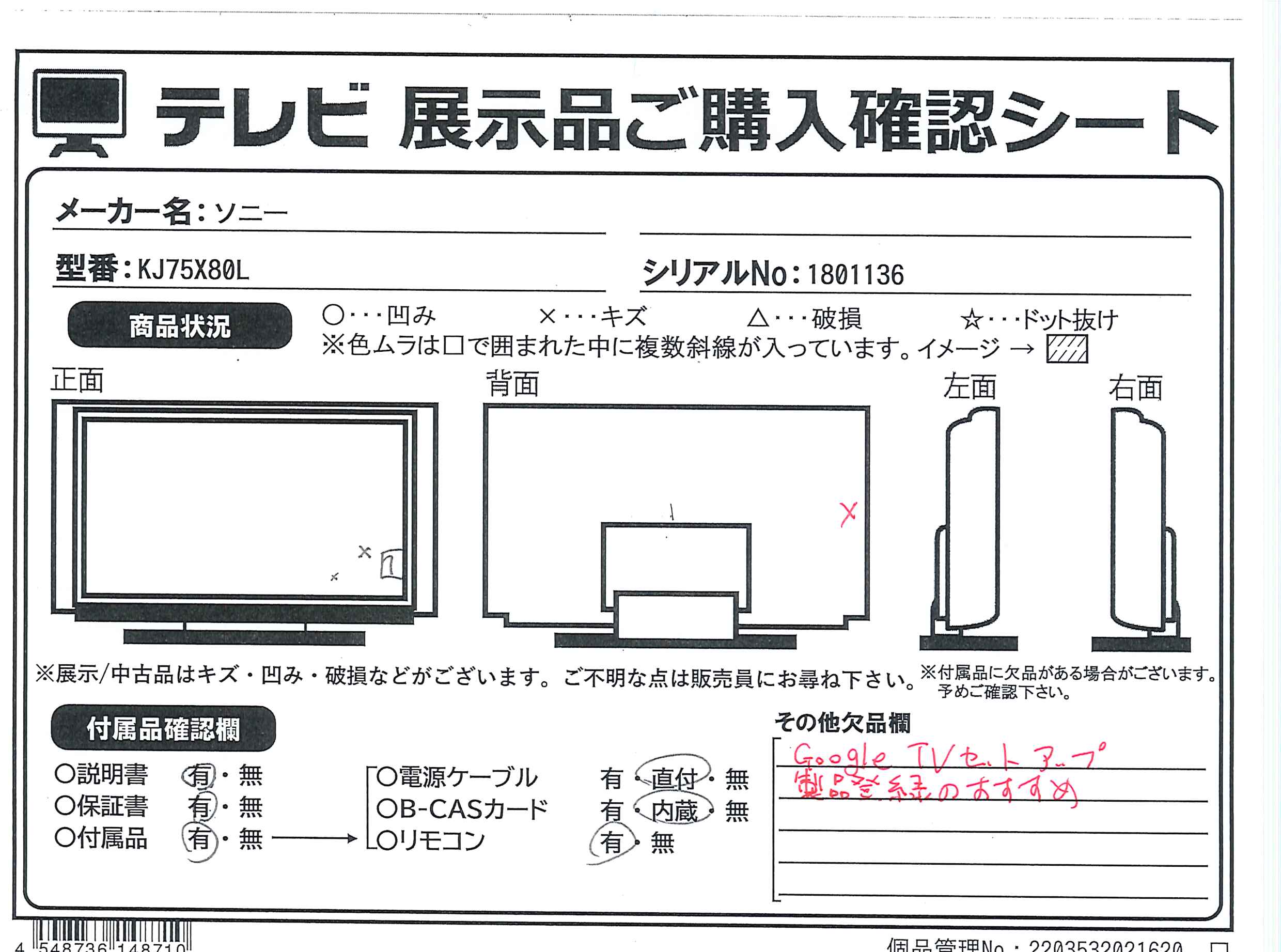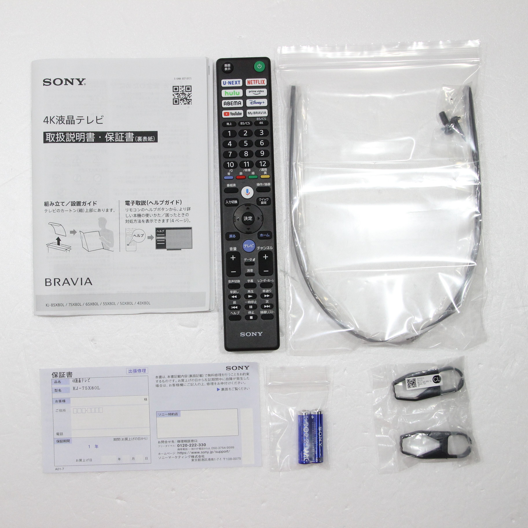 中古商品ランクについて 付属品・商品状態について 〔付属品〕説明書、組み立て/設置ガイド、リモコン、リモコン用乾電池×2、スペーサー(VS)×4、スタンド一式、転倒防止部品一式、ケーブルクリップ(CL)×2