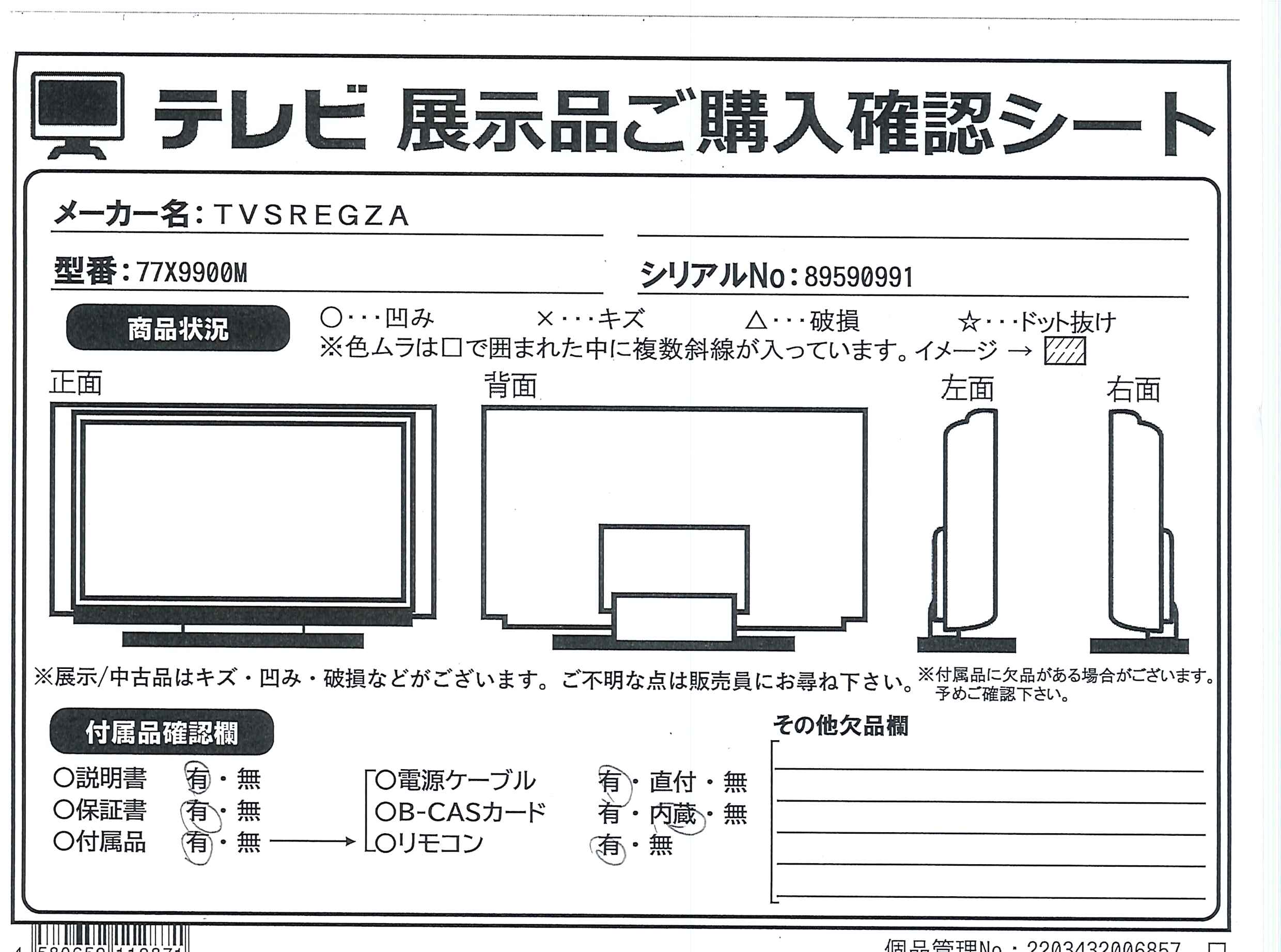 中古商品ランクについて 付属品・商品状態について 〔付属品〕説明書、スタンド一式、リモコン、単四型乾電池×2、電源コード、転倒防止バンド一式、背面カバー、スタンドカバー左右一式