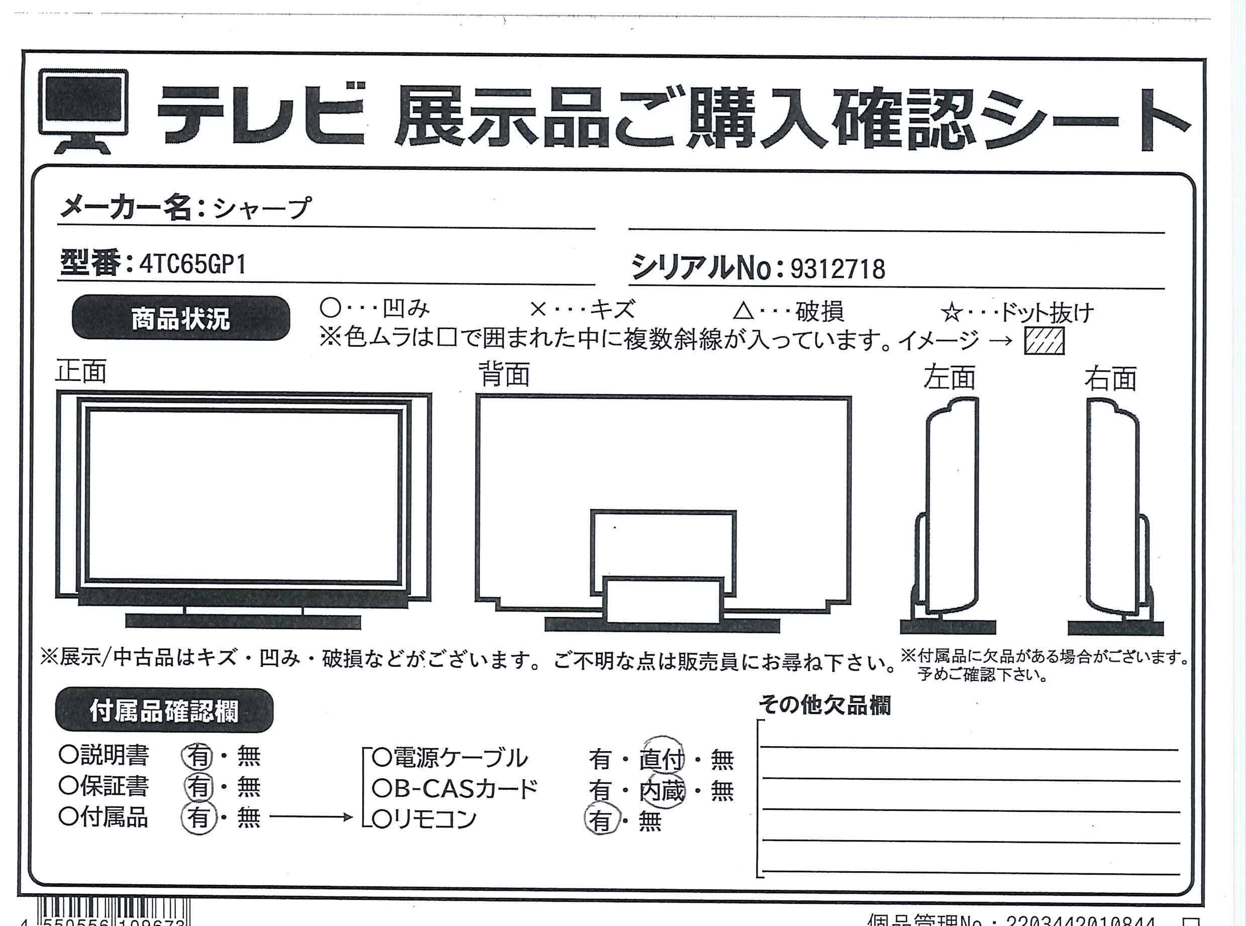 中古商品ランクについて 付属品・商品状態について 〔付属品〕取扱説明書、かんたん使い方ガイド、リモコン、単4形乾電池×2、スタンド取付金具、スタンドカバー、スタンドベース、スタンド組立用ネジ×4、スタンド取付用ネジ×4、転倒防止ベルト、転倒防止ベルトテレビ取付用ネジ、転倒防止ベルトテレビ台固定用ネジ、スタンド回転ロックネジ