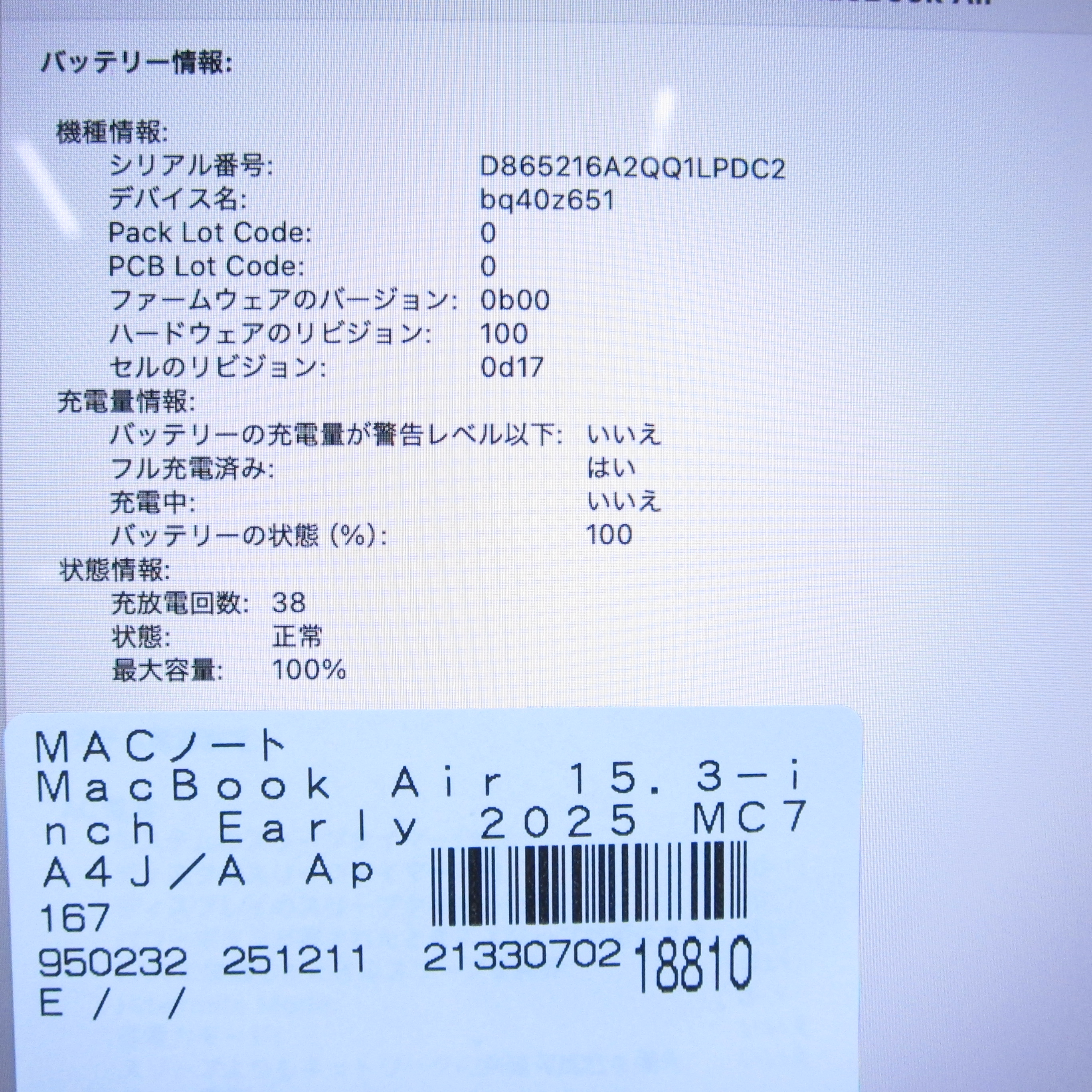 〔中古品〕 MacBook Air 15.3-inch Early-2025 MC7A4J/A Apple M4 10コアCPU_10コアGPU 16GB SSD256GB スカイブルー 〔15.7 Sequoia〕 [グラフィック:オンボード/JISキーボード]