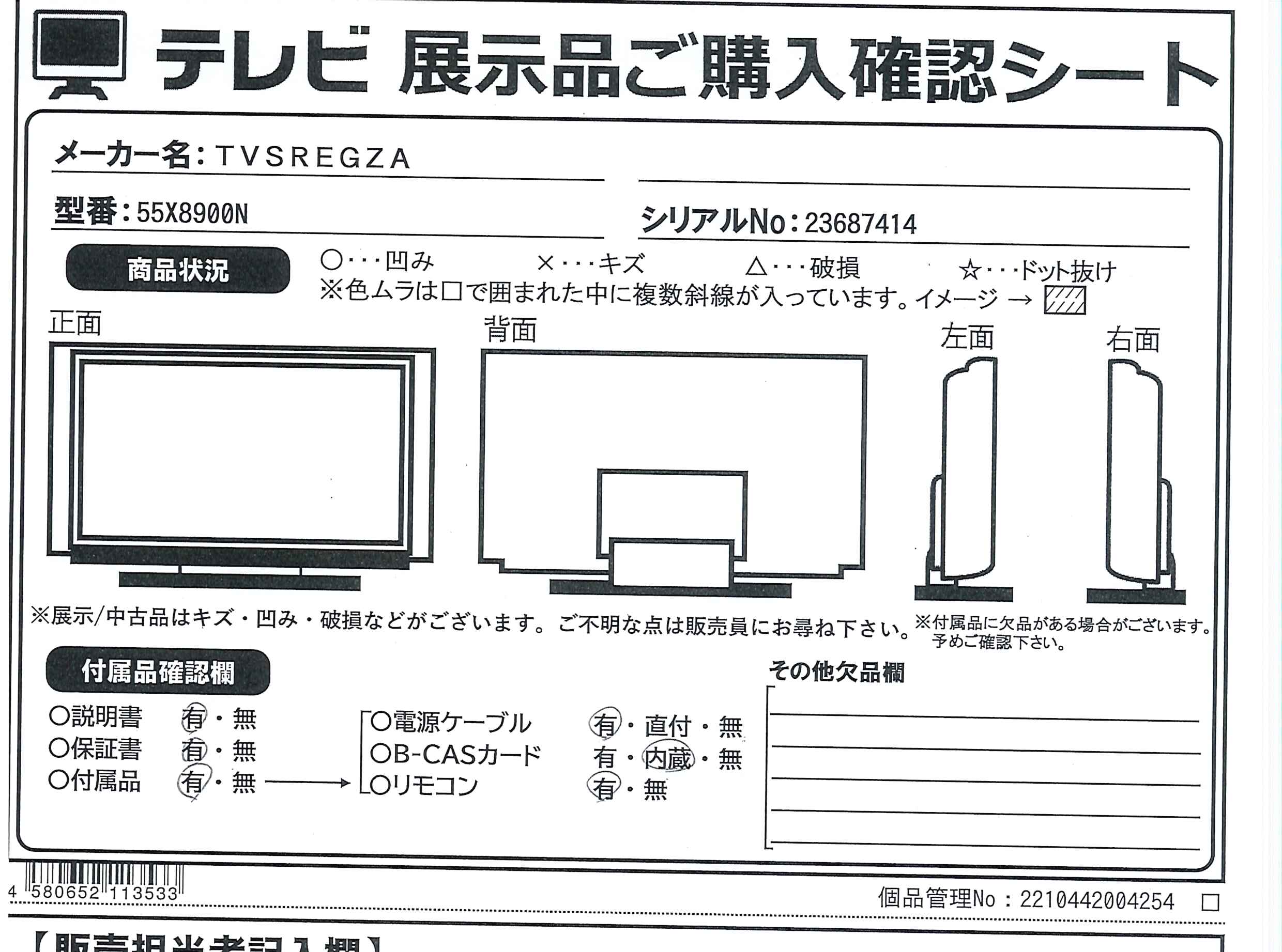 中古商品ランクについて 付属品・商品状態について 〔付属品〕説明書、スタンド一式(M5ネジ×8)、リモコン、単四形乾電池×2、電源コード、転倒防止バンド一式、コードクランプ、スタンドカバー、背面カバー