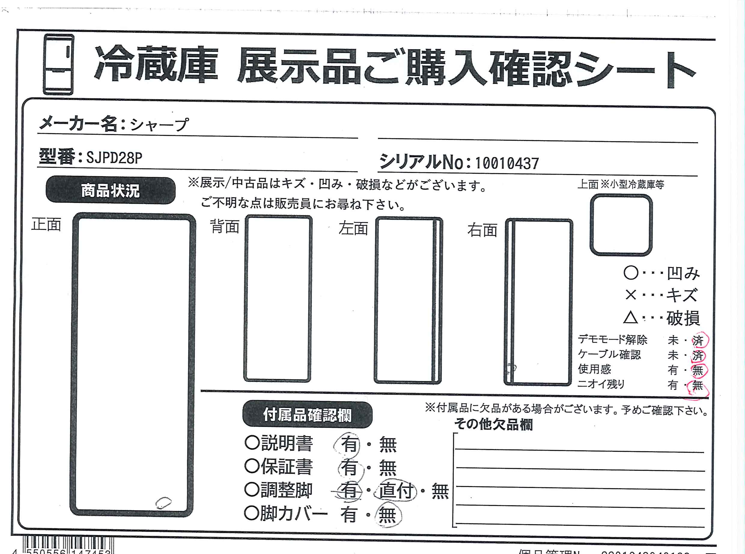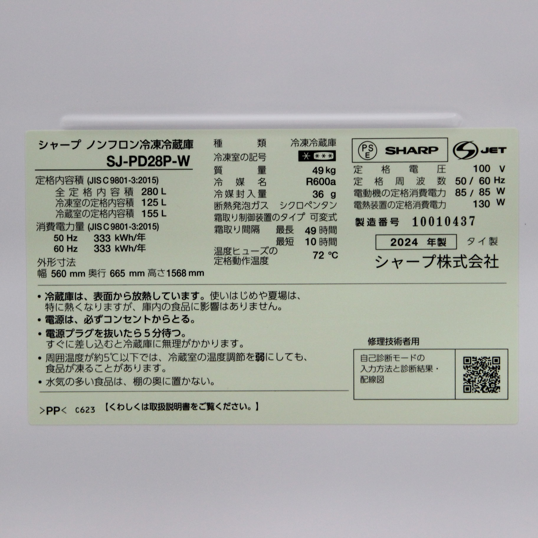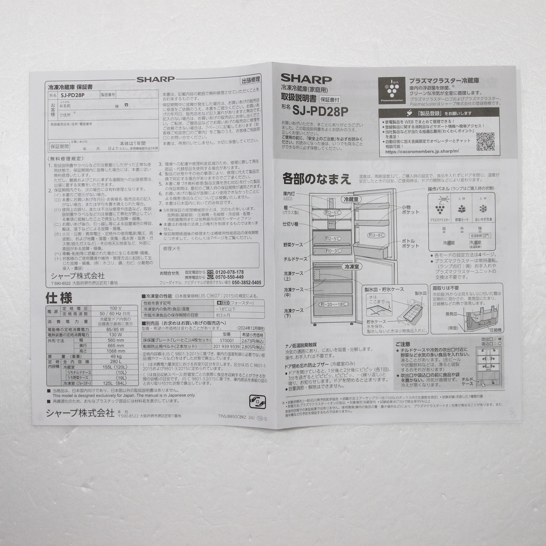 〔展示品〕 冷蔵庫 アコールホワイト SJ-PD28P-W [幅56cm /280L /2ドア /右開きタイプ /2024年]